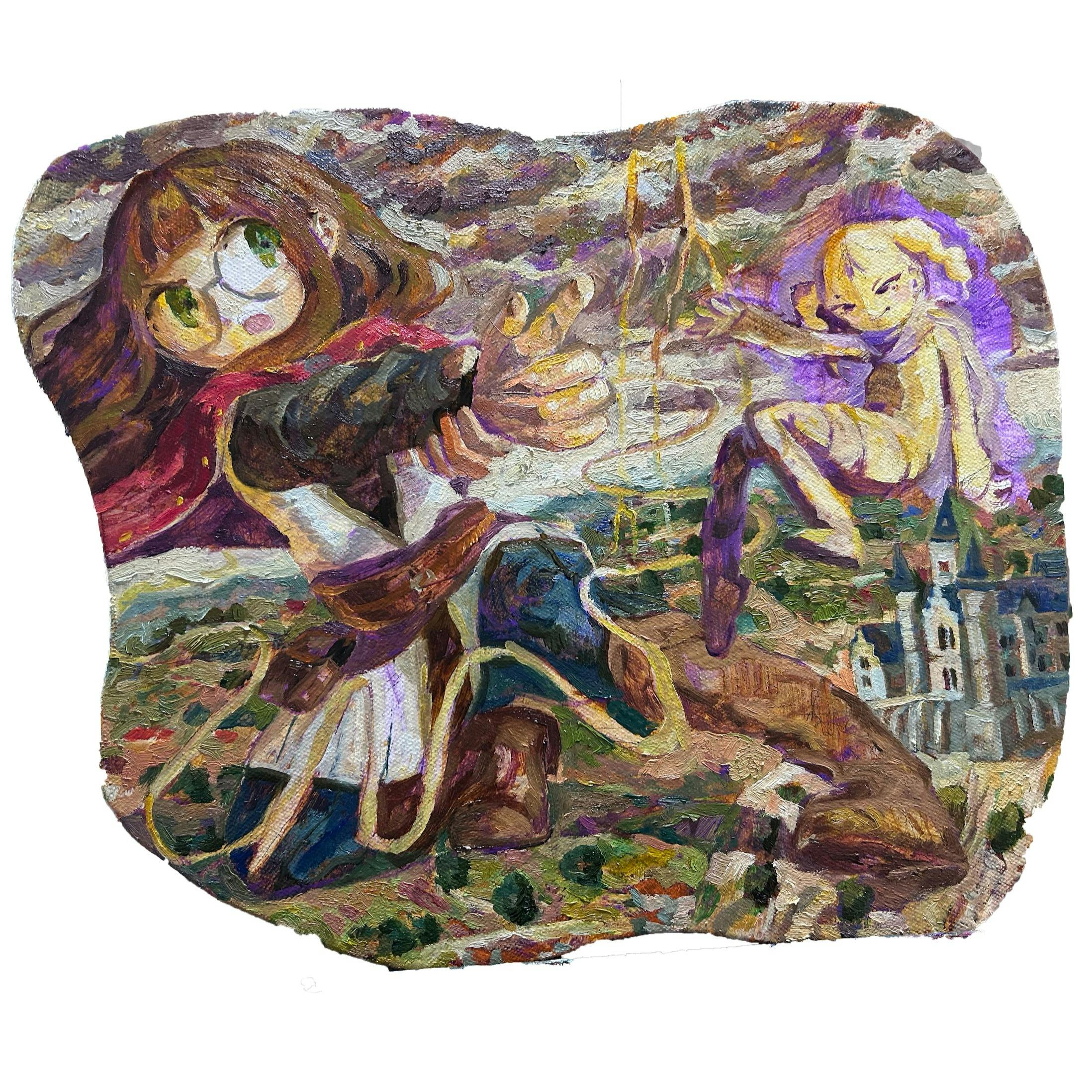 濱田むぎは1999年埼玉県生まれ。2023武蔵野美術大学造形学部油絵学科油絵専攻卒業。魔法使いという設定の架空の少女と、その周りの人物や環境をテーマに制作する。自身の何気ない体験を架空の世界のモチーフに反映させていくのと同時に、物質としての絵画の追求を行い、創作されたキャラクターの新しい在り方を模索している。最近は変形パネルを用いて制作している。主な個展に「夜ならあなたの顔がよく見える」(木之庄企畫、東京、2024)、「みちみちの箱庭」(Art Gallery Shirokane6c、東京、2023)、「地下室から星を眺めて」(LIGHT HOUSE GALLERY、東京、2022)、グループ展に「199x12 ふゆやすみ/成果展」(Gallery Yukihira、東京、2024)、「KINOSHO KIKAKU Group Show 2023 vo.2」(木之庄企畫、東京、2023)、「MINI◯展」(SANSIAO GALLERY、東京、2023)など。