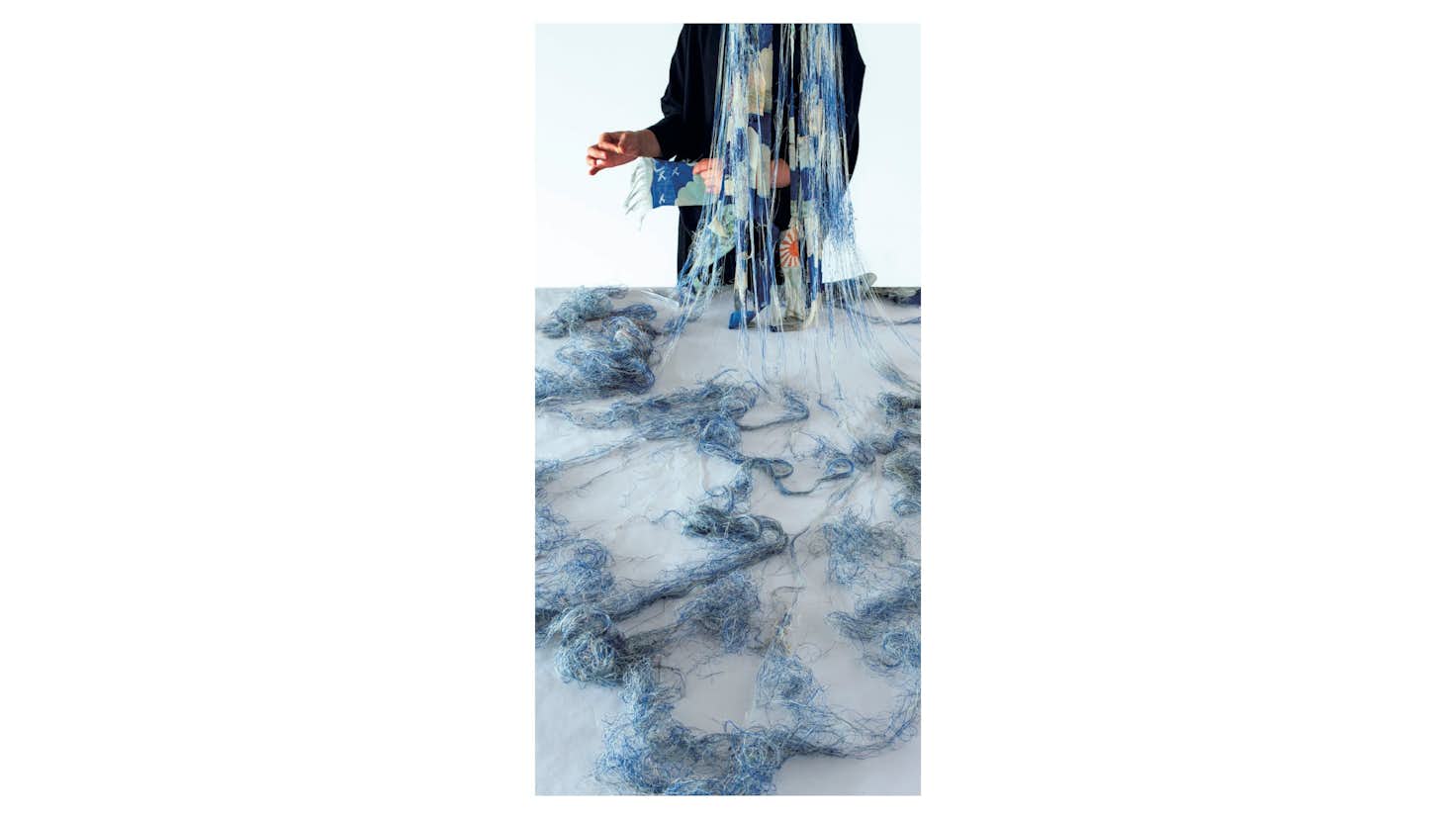 平野は、古着の衣服や傘などを糸の一本一本にまで解き、結び直して再構成するインスタレーションを手がけてきた。糸という素材に還元することで時間を可視化させ、そこに個人の記憶、社会や歴史の関係を浮かび上がらせる。本展では、戦争柄の着物を解いたインスタレーションとドローイングを展示している。