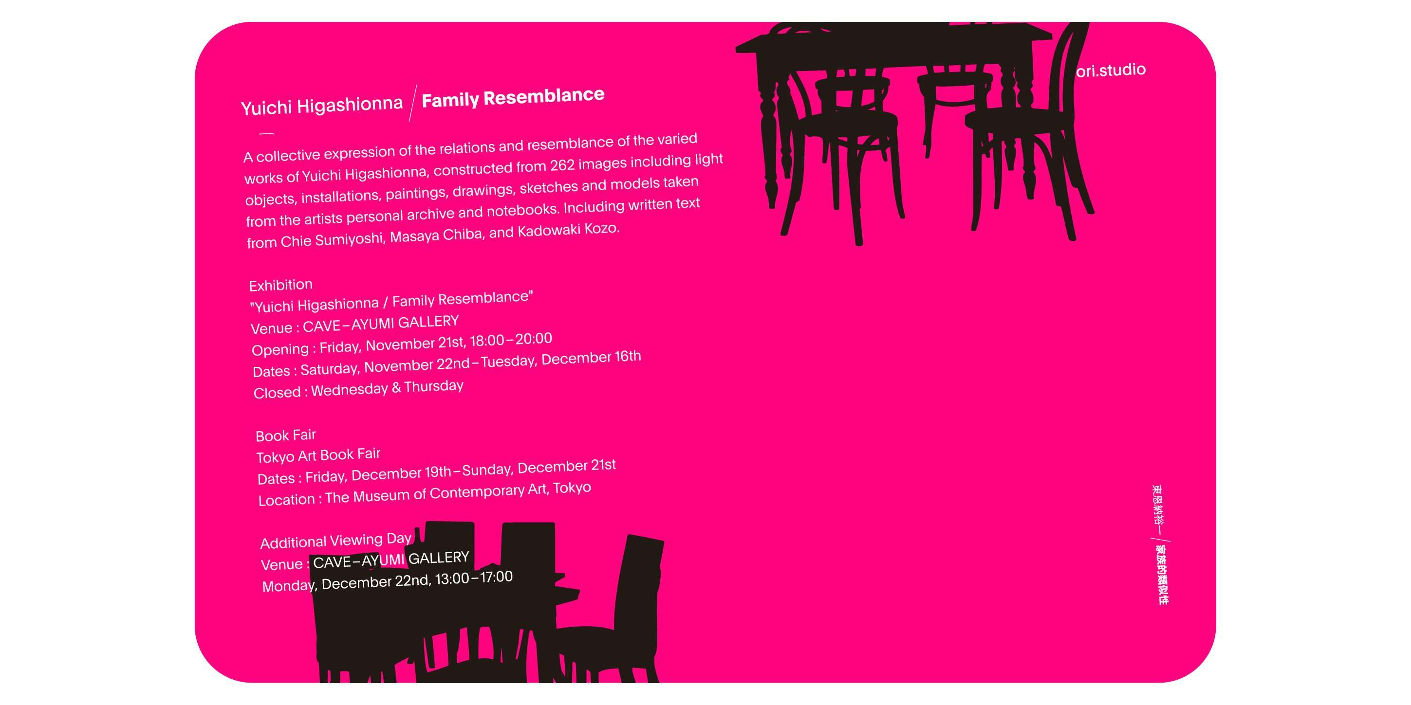本展は、ori.studioより刊行される作品集『Family Resemblance』の出版を記念して開催するもので、最新作を含む作品群を展示。会場では、刊行された作品集を展示・販売している。同書は、東恩納の創作活動を網羅的に紹介する内容で、作家のアーカイブやノートから選ばれた262点のイメージと、住吉智恵、千葉雅也、門脇耕三によるテキストで構成される。今回の展示では、これらの出版と関連する展示を通して、近年の東恩納の活動に注目することができる。