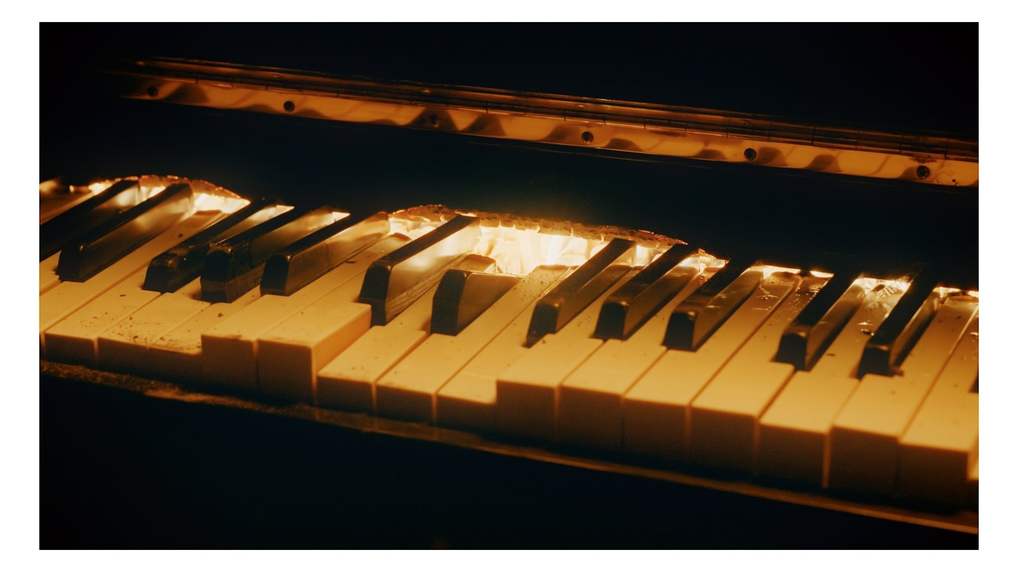タイトル「Act of Fire」は、向井山の身体と記憶に根ざす喪失・抵抗・怒りに関わる表現と、ジェンダー不平等、自然災害、侵略などの現実世界の問題を「火」というメディアによって示す行為を指す。家族の肖像、火祭り、経血、津波の泥、燃え尽きるピアノなどのイメージを提示する。