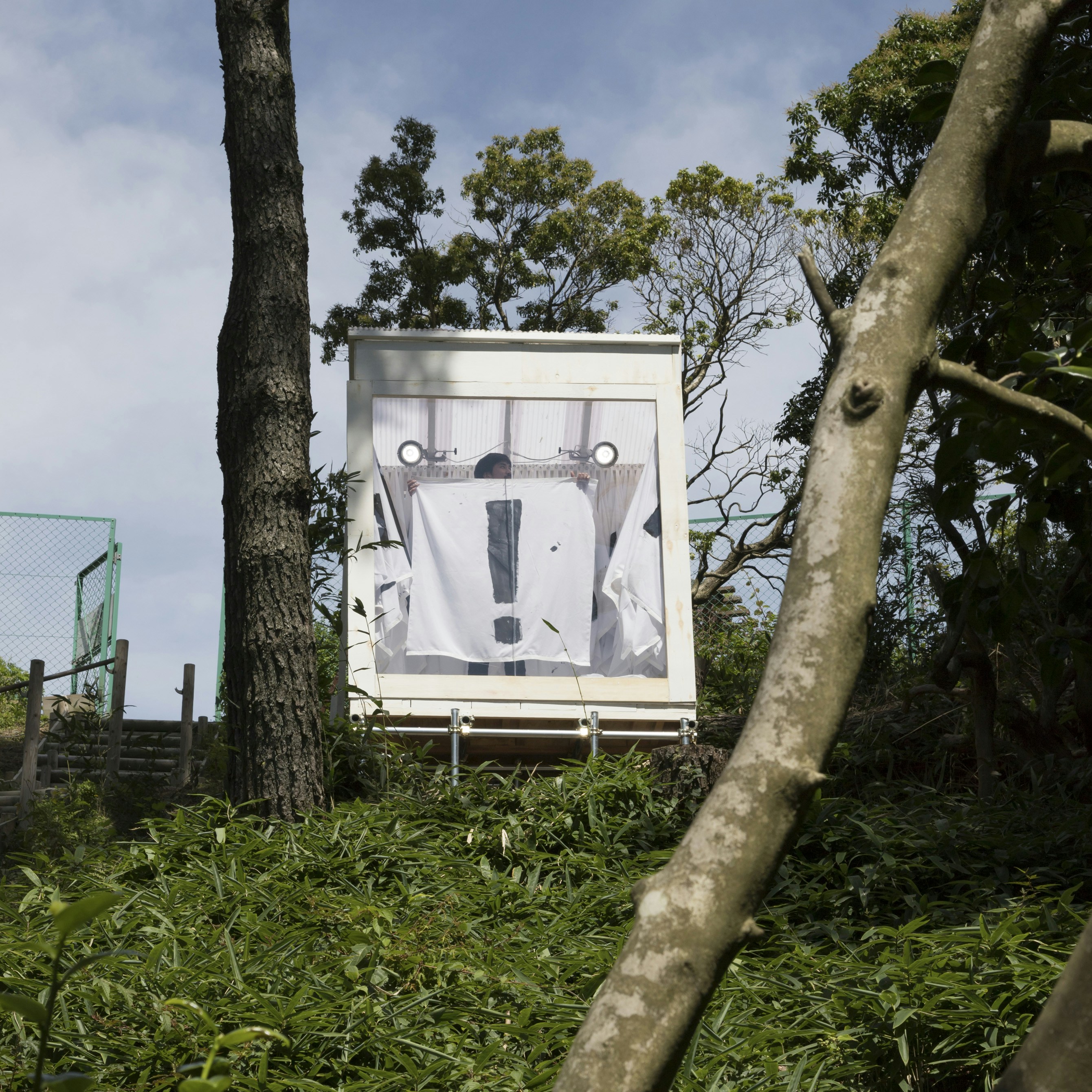 特筆すべき作品は古屋崇久《こんにちは》。双眼鏡のある場所から約350メートル離れた白い小屋で、時折作家がひらがな、数字、記号などの文字が書かれた布を掲げて言葉を発信するのだが、双眼鏡で覗き見ることができる文字は限られているため、それらは都合よく理解され、誤解され続ける。SNS上のコミュニケーションを対極的な自然のなかでアナログに表現することで、その異様さを浮き彫りにした。