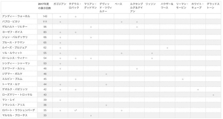 2017年度に個展・グループ展で展示された回数の多い上位20アーティストとその主な取り扱いギャラリー(ここに登場しないギャラリーが取り扱うアーティストもいる)
