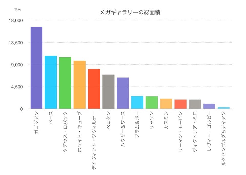 「artnet」が選んだのは、「メガ」、「ハイ・エンド」と呼ばれる14のギャラリー。各拠点の展示スペース・オフィス・ストレージを合わせた総面積ランキング 参照=artnet