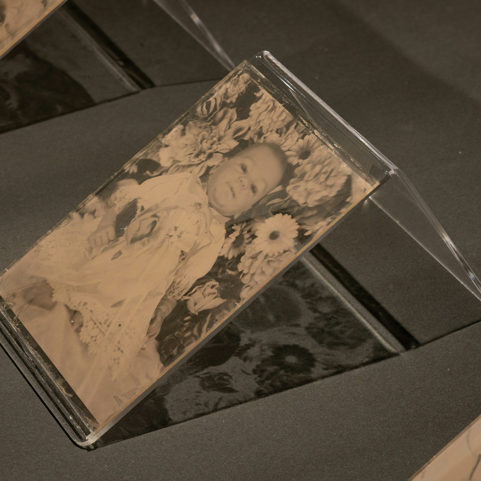 T:では早速、こちらから見ていただきたいのですが。湿板写真のアンブロタイプが9点、 3点ずつ3つの硝子の箱に収められている。感光版は硝子。コロジオンを始めとする薬剤が感光版の表面に淀みやムラを残していて、まだ濡れているようにも見えますね。上からの照明が当たって、台の上に反影をつくっている。まるで死んだ赤ん坊を永遠の眠りとして残すために撮られた19世紀の死後写真(Post-mortem photography)のようですね。被写体は赤ん坊の人形ですが、焦点が定まらない目を見る限り、まるで屍体のようだ。