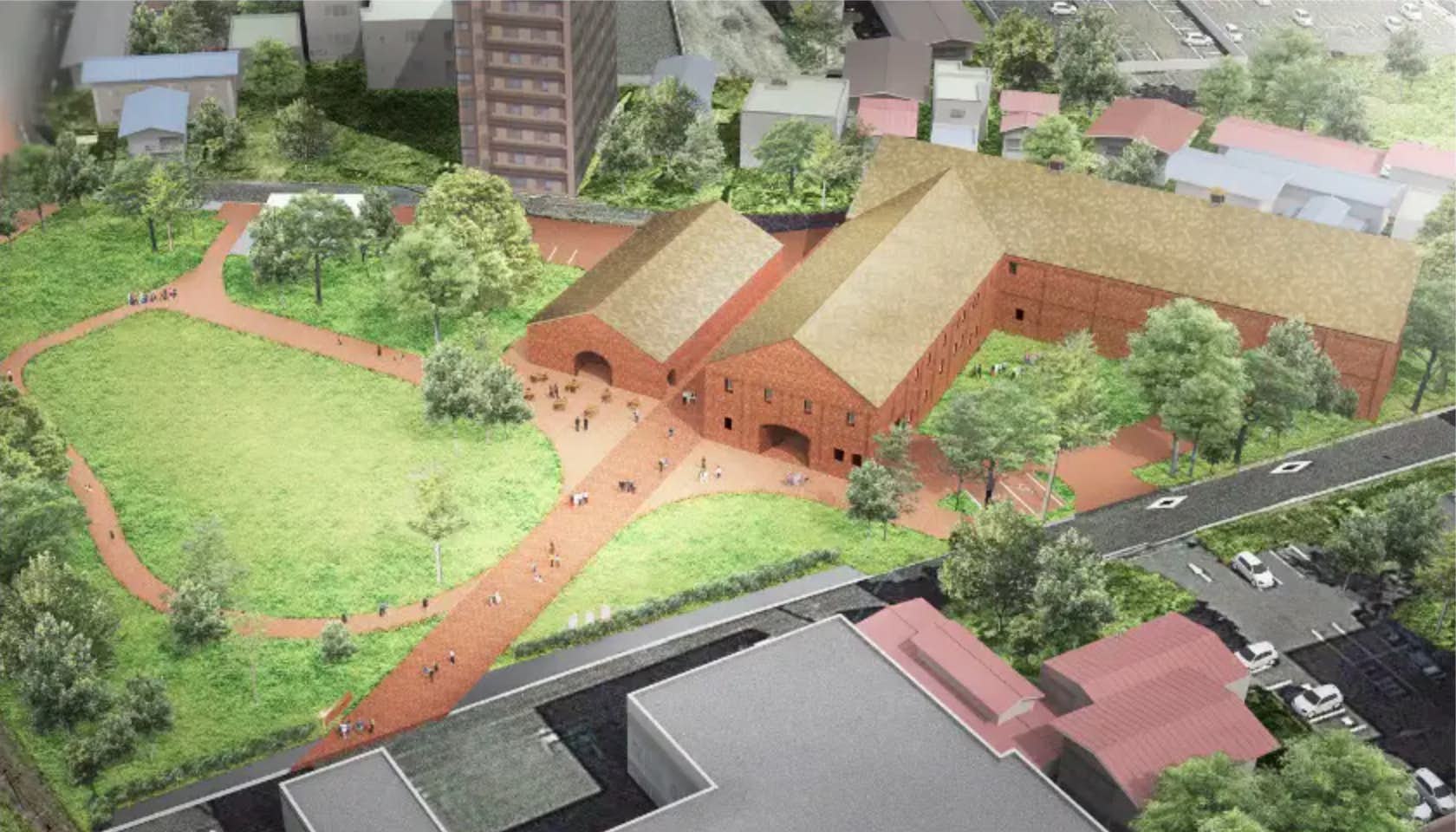 上空からみた弘前れんが倉庫美術館のシードル・ゴールドの屋根 (C) Atelier Tsuyoshi Tane Architects
