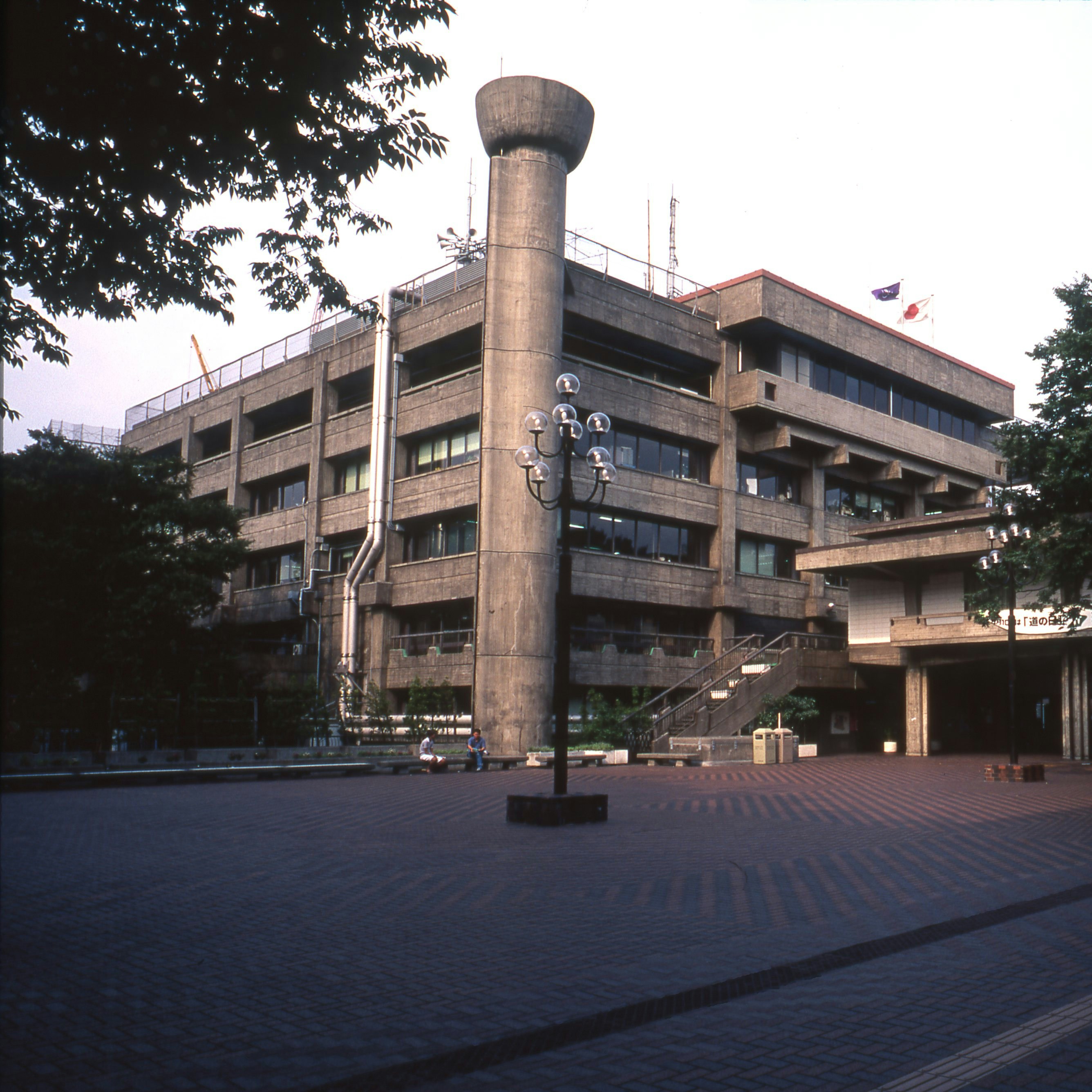 西側の都道に面して設けられた欅並木のある前庭とピロティの風景。今回の改築によって、このほど良いスケールの広場はすべて失われ、ここに地上10階、高さ約45メートルの新庁舎が建ち上がることになる。