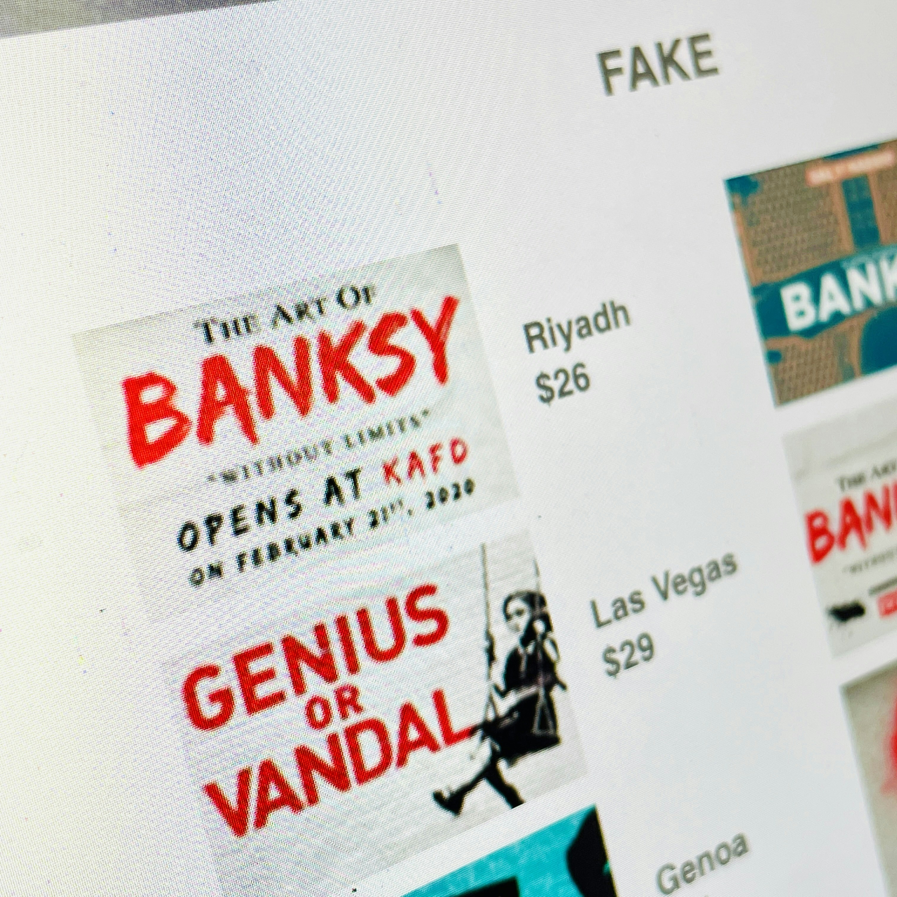 ひとたび新作が発表されると、世界各国のメディアが速報ニュースを流すのが当たり前になったバンクシー。日本でも知名度が高まっているが、同時に増えているのが、非公式の展覧会やマーチャンダイジングだ。バンクシーの公式サイトでは、「FAKE」と題したページで非公式展の開催地と入場料をリストにして「アーティスト本人は関与していない展覧会です」と抗議文を掲載している。また、バンクシーの作品認証などを代行する機関ペストコントロールの公式サイトでは「本物らしく見えるグッズはすべて非公認です」と警告している。こうした作家本人が不在の”非公式シリーズ”に、私たちはどのように向き合えばいいのだろうか? そこには手軽に作品や文章を発表できる時代になったいま、誰もが無関係ではいられない著作権や経済市場の問題がある。