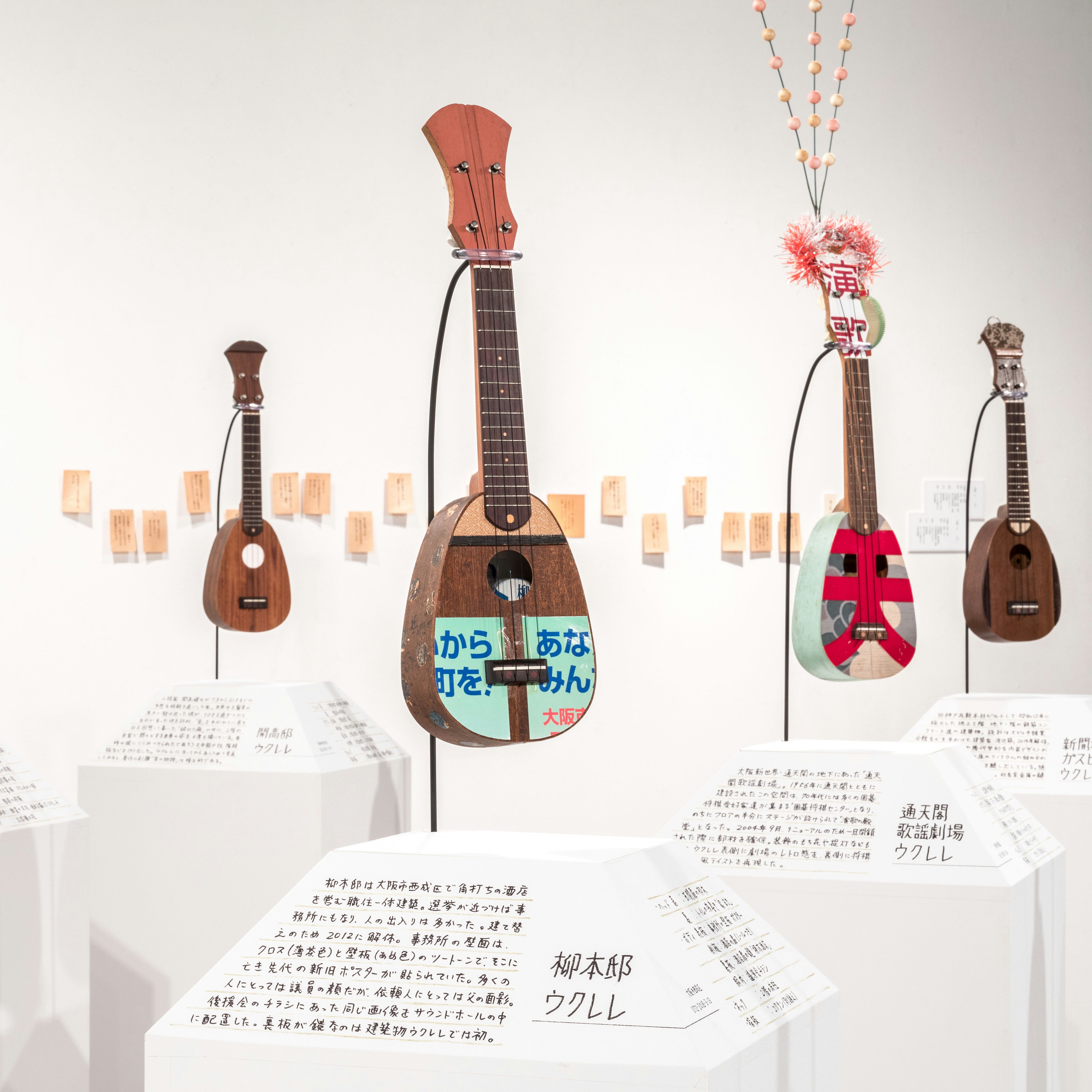 伊達伸明は関西で活動するが、仙台にゆかりのある彼は、震災後、釜炊きの燃料や木工細工に用いられてきた仙台の亜炭にまつわるプロジェクト(*1)を数年間実施してきた。本展では、これまで東北では未紹介であった彼のプロジェクト「建築物ウクレレ化保存計画」で制作された16のウクレレを展示した。これは、取り壊される建築物の部材を用いてウクレレを制作するもので、2000年から続けられている。これまで公共建築から個人住宅までさまざまな建物がウクレレとして保存されてきた。経年によって生まれる豊かな質感の建材や内装の一部がウクレレのパーツとなって生き残り、そこで生活した人々の時間を、展示台に示された履歴とともに物語る。しかし、温故知新と言えば収まりがよいが、実際には止むことないスクラップ&ビルドのなかの21年の活動である。時の流れには逆らえず、ウクレレに込められた記憶が遠のいてゆくことも否めない。時折流れる録音されたウクレレの音色は、伊達の言う「トホホ〜な感じ」を軽やかに醸し出していたのではないだろうか。今回はそうしたペーソスの表現として、方丈記を記した鴨長明と伊達の架空の対話作品《ふたりのN明》も展示した。