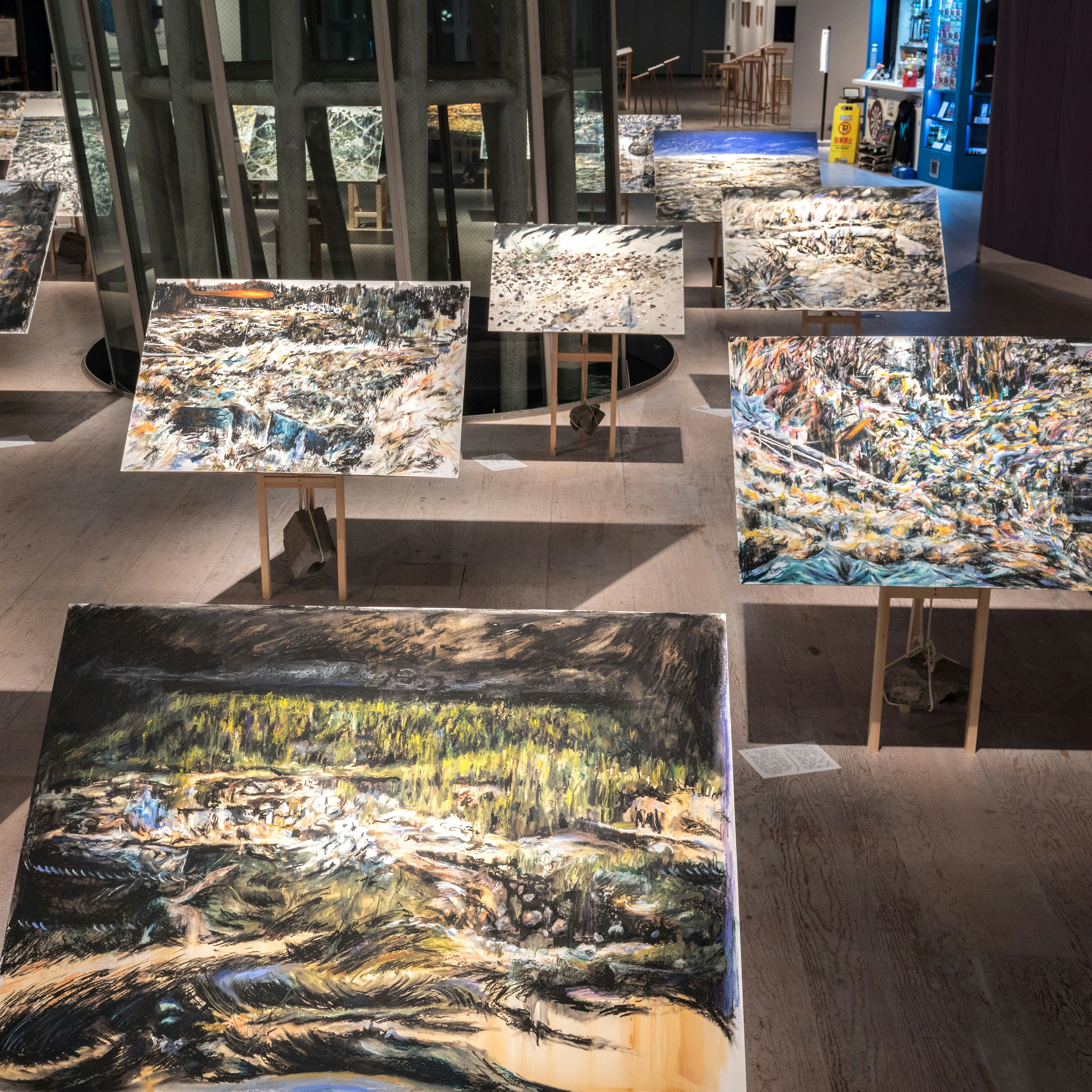 建築を学んだ菊池聡太朗は、宮城で活動する写真家の志賀理江子の制作を学生時代から手伝うなどしながら、自身もドローイングを中心とした制作と展示発表をしてきた(*2)。菊池は、このところ「荒れ地」を主題にしている。荒れ地は、コロナウイルスの流行以後、T・S・エリオットの詩が数多く引用されたため馴染みもあるが、菊池は、エリオットのように死や社会荒廃の象徴としてではなく、荒れ地を慈しもうとしているようだ。親しんだ宮城の風景のなかで、心象と重なる場所を荒れ地として描きだすのであるが、それは自然の造形とも、打ち捨てられた空き地のような人為的なものとも受け取ることができる。人為とすれば資本主義経済の残滓として反省的にとらえることもできるが、菊池はそれも含めて荒れ地を肯定的に眺めている。むしろ、野ざらしの観察こそが人間性の回復に接続すると確信しているように思われる。本展では、21作品を自立させて展示し、地名の消された地図によって荒れ地を眺めた作者の視点も示された。さて、菊池は「建築ダウナーズ」という建築系のデザイングループにも参加している。建築ダウナーズ(白鳥大樹、千葉大、吉川尚哉、菊池)は、後に紹介する小森はるか+瀬尾夏美の展示デザインもおこなった。
