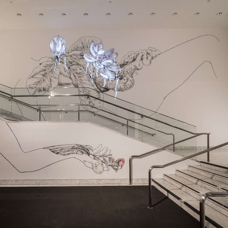 「ここ10年ほどのあいだに発表したインスタレーション作品をいくつか紹介しましょう。『AT ART UWAJIMA 2013』というプロジェクトでは愛媛県宇和島市にある木屋旅館を舞台に、永山祐子さんのリノベーションした建築とほしよりこさんが書いた小説とコラボレーションした《木屋の染み》(2013)を発表しました。ロサンゼルスのハマーミュージアムでは手描きのドローイングに映像を投影した《flow-wer arrangement》(2017)という作品を発表しています。大きな空間を、自分の作品の一部にしていく作品が多いです」。