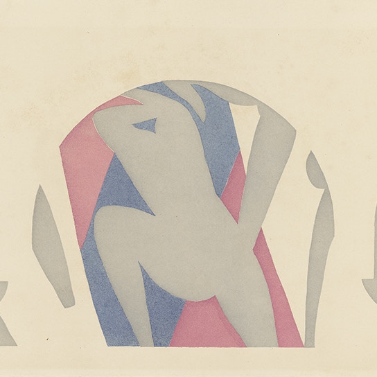 マティスは、ある日突然ハサミを持ち出して切り紙絵を着想したわけではありません。じつは、それ以前からしばしば下絵制作の段階で切り紙絵の手法を取り入れていたのです。その代表例として知られるのが、1930年、アメリカの大コレクター、アルバート・バーンズから依頼された壁画の大作《ダンス》でした。この時、彼は構図や色彩を決定するために、「切り紙」を活用しはじめます。各モチーフをあらかじめ紙に切り抜き、位置を微妙に調整しながら無限にシミュレーションを重ねることができる切り紙絵は、マティスにとって時間と労力を節約できる制作手法となっていきました。