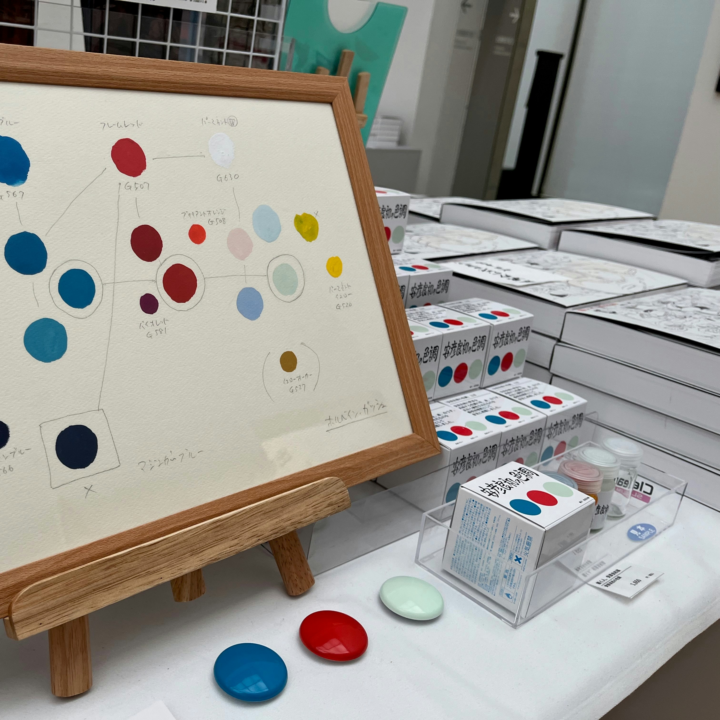 「描く人、安彦良和」の会場でも堪能できる、安彦良和の世界観を表現するために調色した、青、赤、白の模型用の塗料。ガンプラを制作する際に使用すれば、アニメーションやポスタービジュアルの世界観の表現ができそうだ。