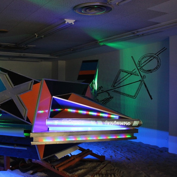 アマゾン川周辺地域でDJブースのように使われるという「音の船」、ナーヴェを展示しているのは、ブラジル生まれのリビジウンガ・カルドーゾ(別名:レアンドロ・ネレフ)。現地にはナーヴェのデザイナーも存在し、様々な形態のものがつくられているという。今回作家が行ったプロジェクトは、自国の文化であるナーヴェを、地球の反対側に位置する日本まで「旅」をさせること。最終的には物々交換によって訪れた人に譲り渡す計画で、現在交換相手を募集中だ。会期中は、設置された装置でサウンドを自由に操作したり、ナーヴェに乗って写真を撮ったりして楽しむことができる。