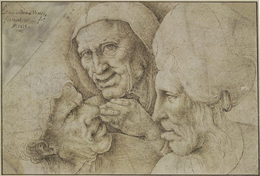 レオナルド・ダ・ヴィンチにもとづく(?)《3つのグロテスクな頭部(売春の場面)》 1550頃(?) 紙にペン、茶色のインク ロンドン、大英博物館蔵 © The Trustees of the British Museum