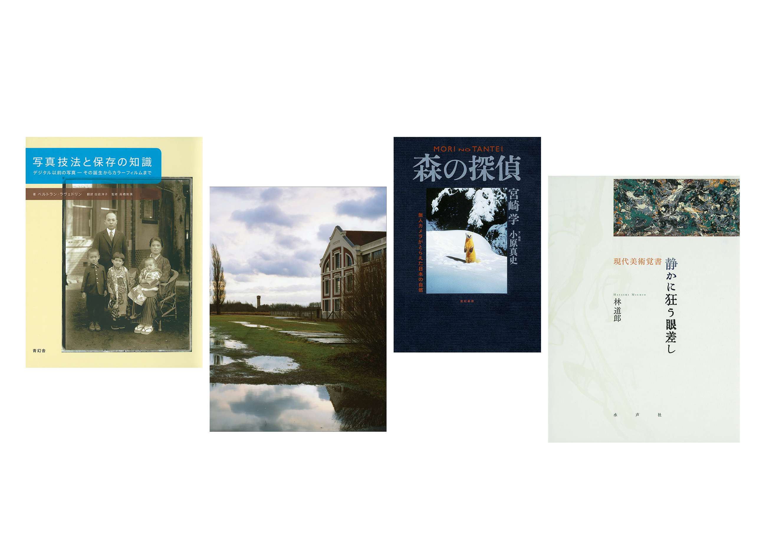 右から『静かに狂う眼差し─現代美術覚書』『森の探偵 無人カメラがとらえた日本の自然』『まっぷたつの風景』『写真技法と保存の知識 デジタル以前の写真─その誕生からカラーフィルムまで』の表紙