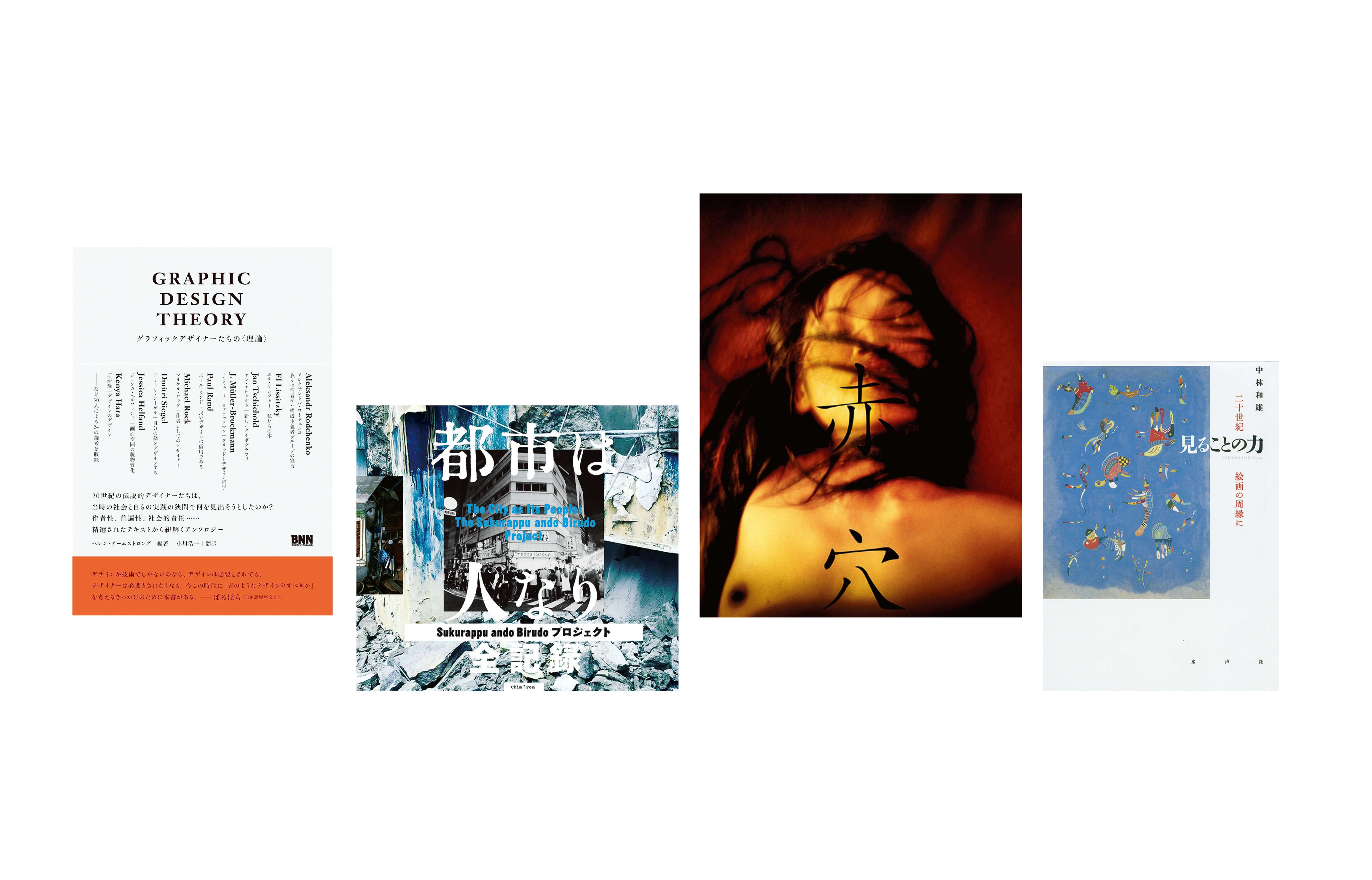 右から『見ることの力──二十世紀絵画の周縁に』『AKA ANA 赤穴』『都市は人なり「Sukurappu ando Birudo プロジェクト」全記録』『Graphic Design Theory グラフィックデザイナーたちの〈理論〉』