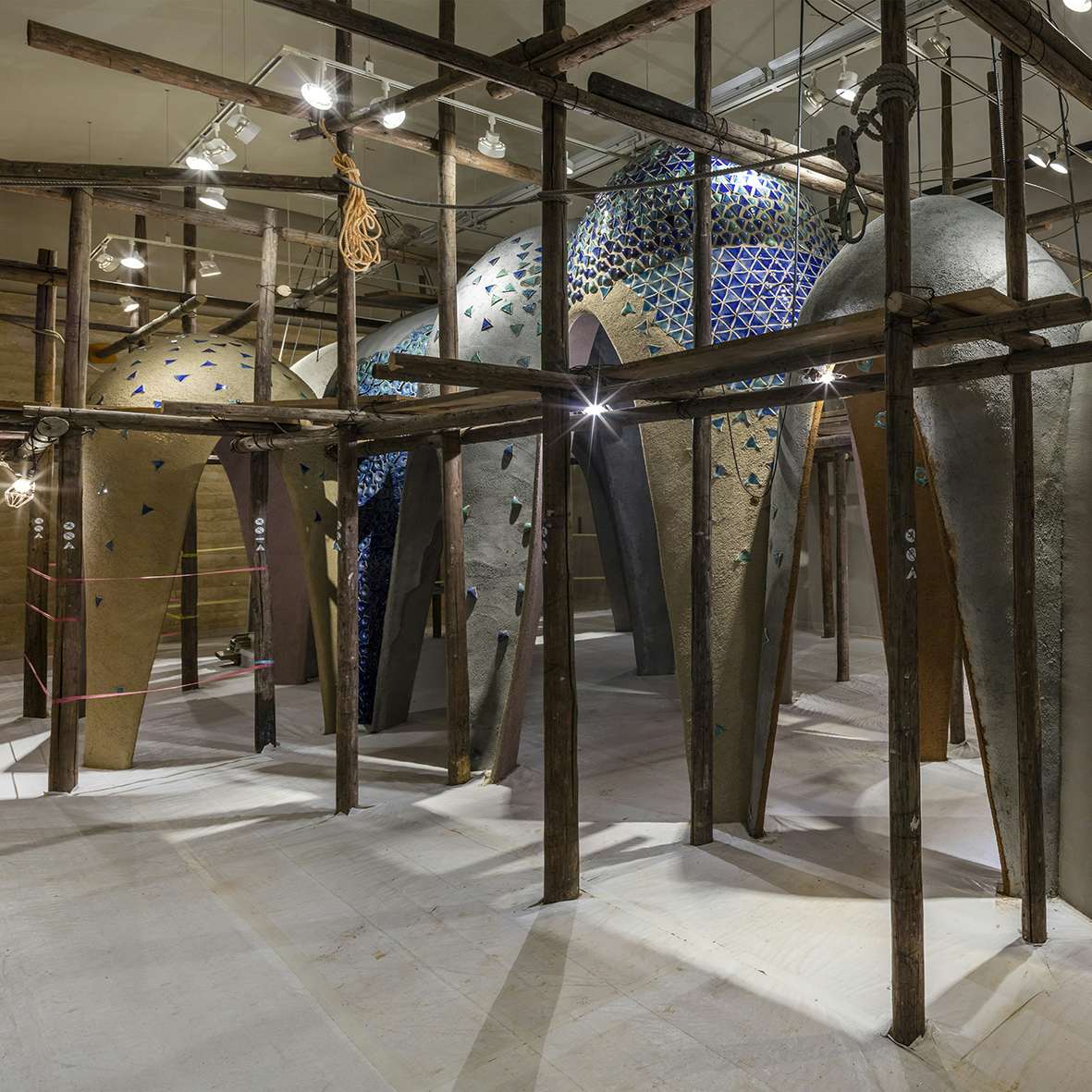 今回の公開制作で、この3人が取り組んだのが、ガウディ未完の世界遺産「コロニア・グエル」に着想した作品。「コロニア・グエル」はガウディが逆さ吊り模型を用いた構造実験に10年もの月日を費やし、結果、半地階の礼拝堂部分しか完成に至らなかった建築(未完成のままガウディはサグラダ・ファミリアの制作に移った)。この「コロニア・グエル」から着想を得たかたちを日置が設計し、久住の左官技術と、白石が特別に制作した3種類のタイルによって、一つの作品を5か月にわたり仕上げていく。