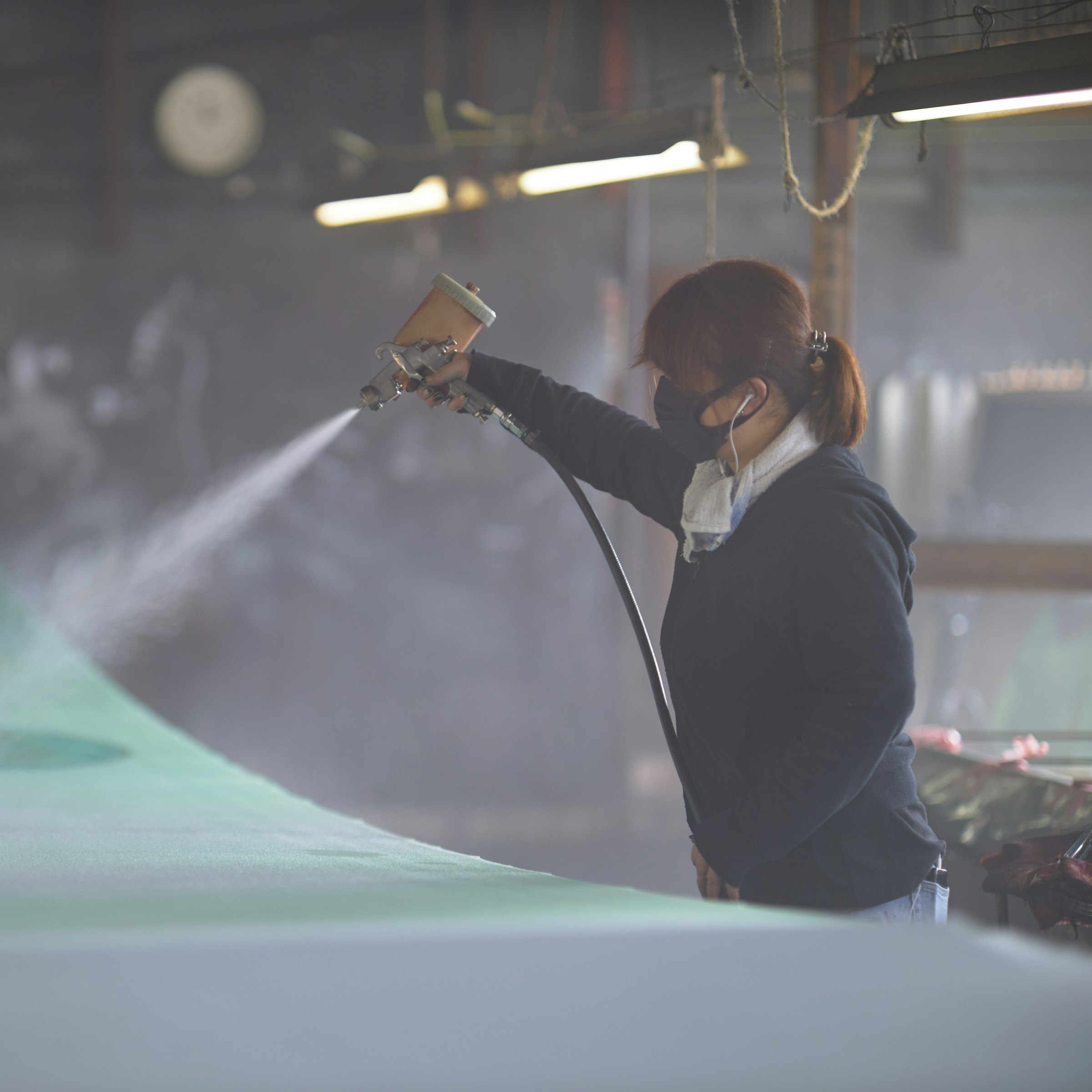 「引き染め」とは、刷毛を引くことから名付けられた染色技法。体育館ほどの広い工房に布帛の生地を広げ、刷毛を引いて地の色を入れる。デザインによって、糊を撒くなどして防染し、刷毛で丁寧に柄を描いたり、ぼかしを入れたりして作品を仕上げていく。