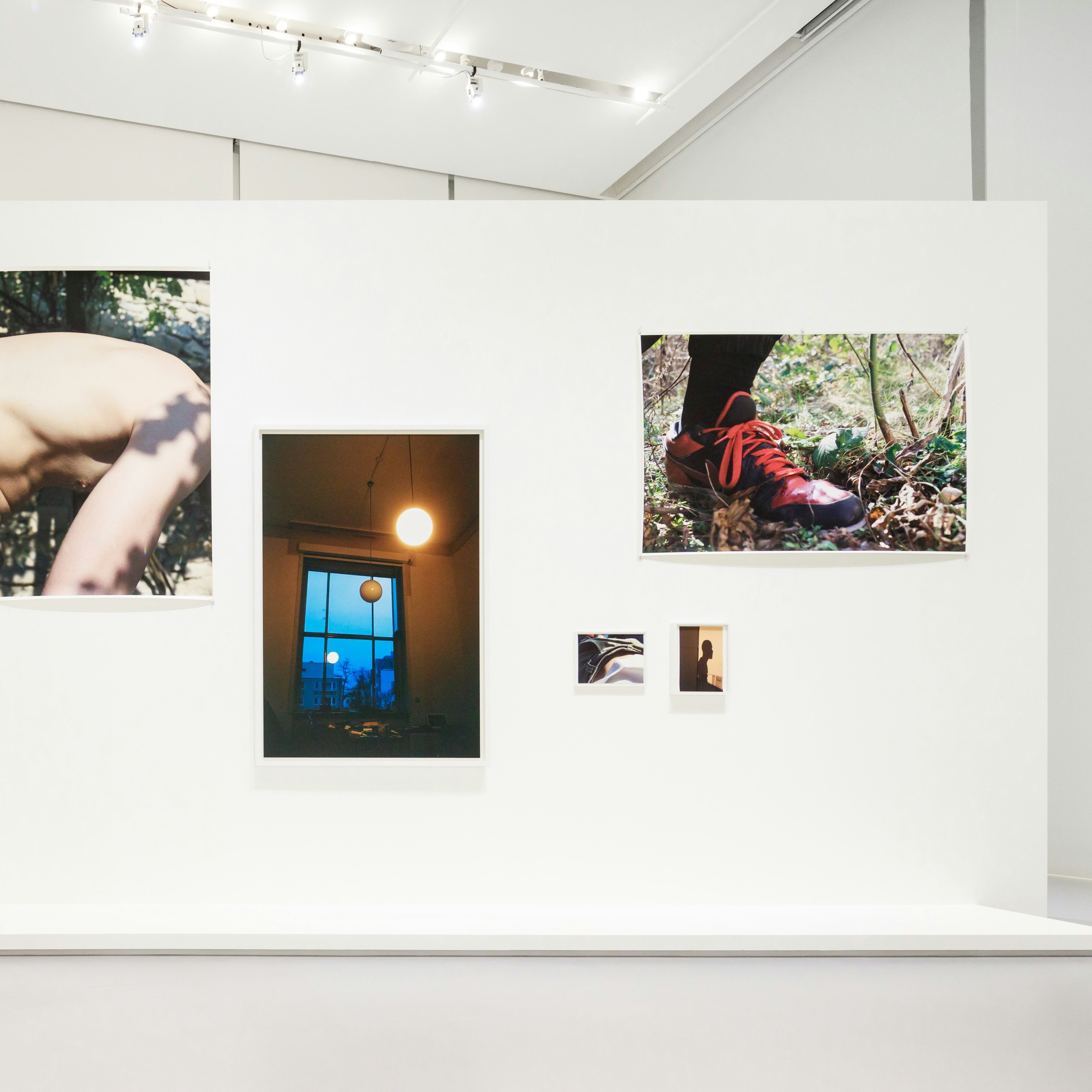 「Moments of Life」と題された展覧会のフロアマップを見ると、展示されている作品はもっとも古いもので2002年、新しいものだと2020年となっている。あるのは日常的ともいえる静物写真やポートレイトなどで、抽象的な作品や写真以外の印刷物の展示はない。大小さまざまなサイズのプリントが、天井高のある空間に立つふたつの巨大な壁の両側に展示されている。展示空間に入ると、それらの壁にまず目がゆく。エスパス ルイ・ヴィトン東京の特徴ともいえる、天井まで続くガラス窓のスクリーンをすべて下ろした空間のなかで、ふたつの壁は閉じられたスライド式の引き違い窓のような存在になっていた。それらは空間を斜めに区切るように設置されている。そのふたつの壁は閉じられていながらも、それをガラスの引き違い窓だととらえるなら、きっと向こう側へと開かれてもいる。