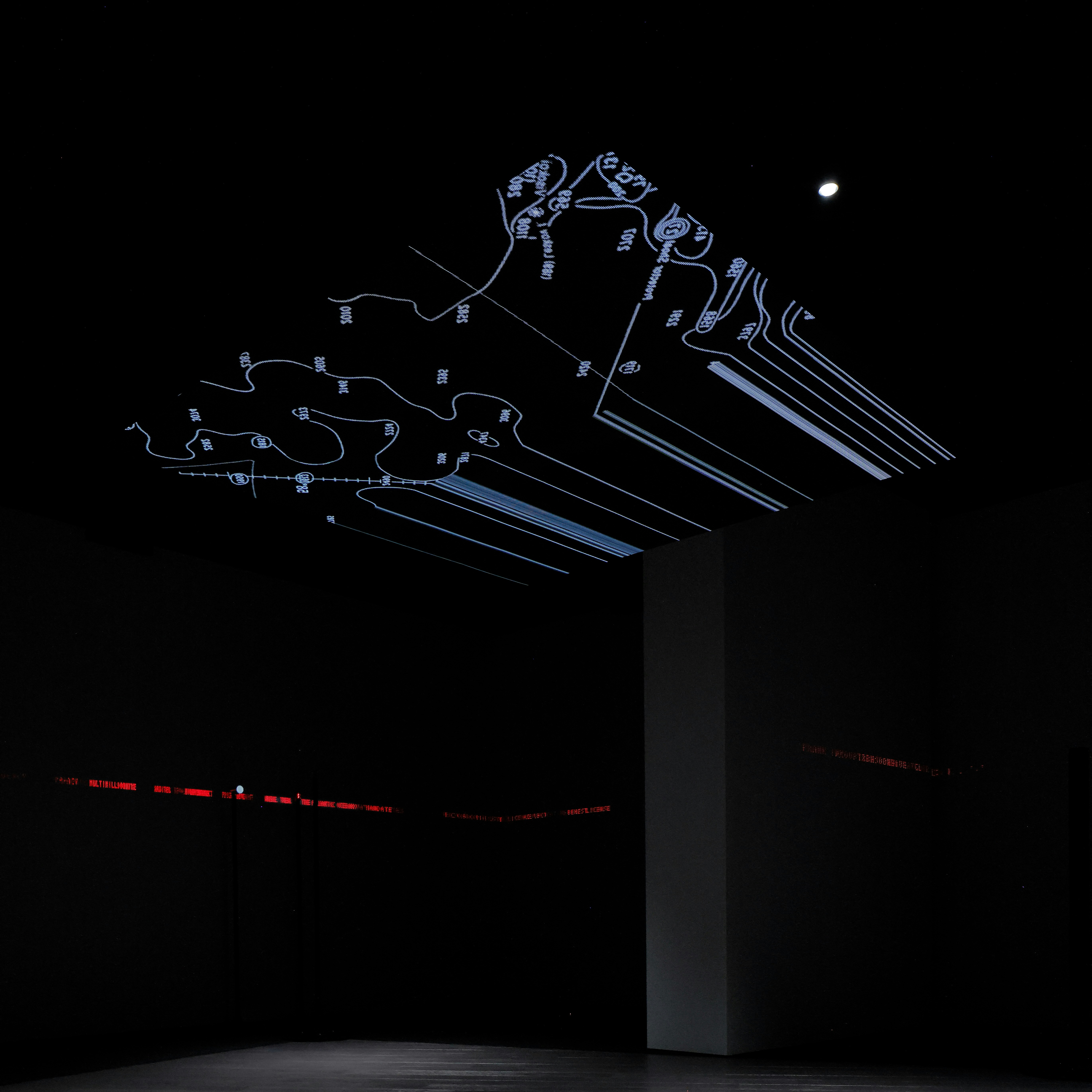 ヴィデオパネルによる装置はもうひとつ、短い通路でつながる奥の小部屋にある。中央に浮かぶように設置されたそれは、鑑賞者の頭上四方を囲み、様々な単語が渦巻く様子を鑑賞者は仰ぎ見ることになる。その意図について高谷は次のように述べた。「一層降りたところから『日本館』を仰ぎ見ているように感じられればと思い、そこから空間構成を考えました」。《2022》ではハーフミラーを通して外を見ることができたが、本展示では新たにつくられた小部屋にその機能がスライドしているのだ。