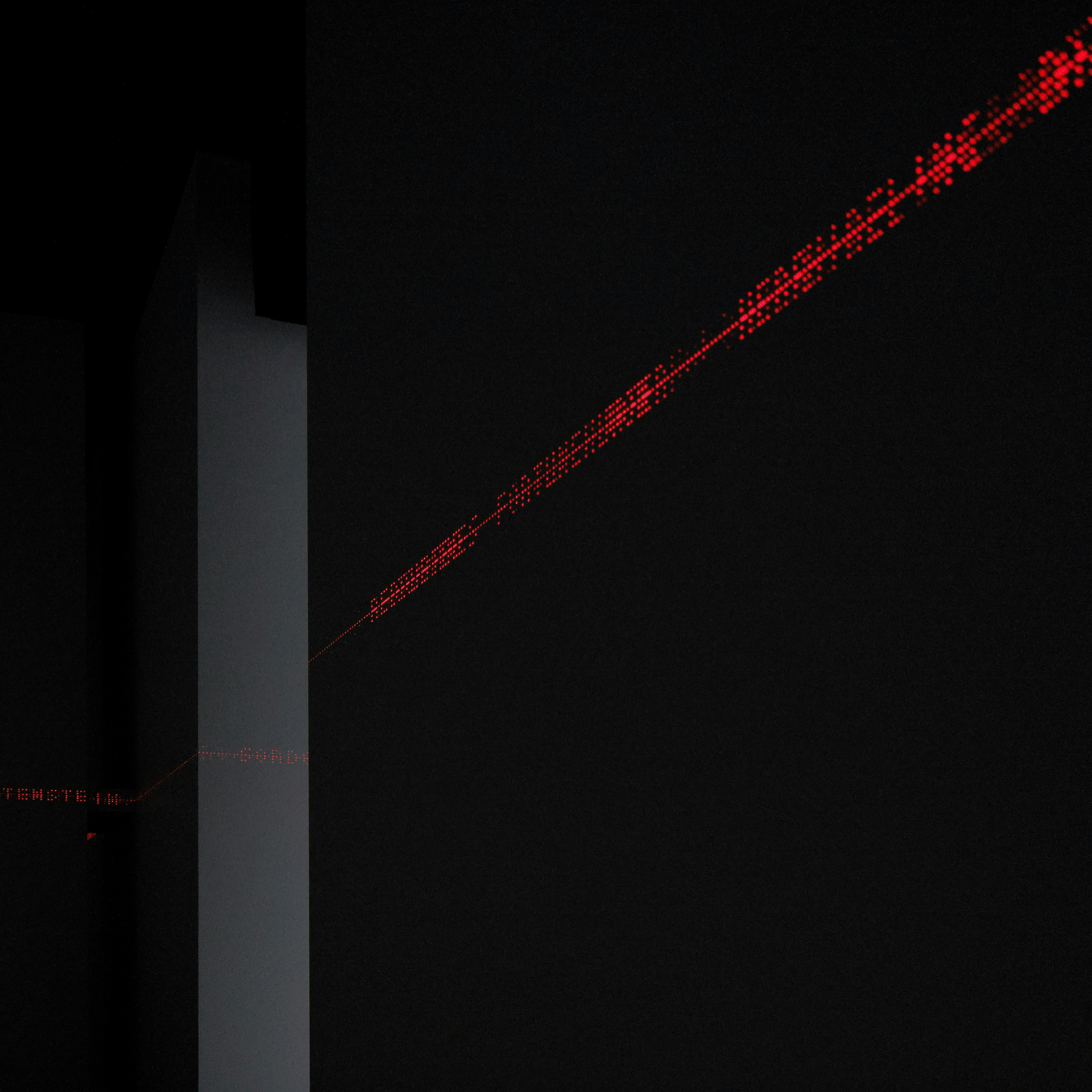 高谷は内覧会で「(ヴェネチアで展示した)《2022》はある意味、日本館を設計した吉阪隆正とのコラボレーションと言っても過言ではない」と語った。なるほど、本作の主要な要素である空間中央のボイドエリアや、その輪郭を形成する非物質的な要素群──レーザーや平行光LEDの光線、超指向性スピーカーから発せられ、時おり鑑賞者の耳元で囁かれる音声など──による空間構成は、日本館の中央上下に空いた穴や、四方の壁から大きく迫り出した4本の柱など、美術作品の展示においては障害物にもなり得るそれらの存在なしには構想されなかったものだ。