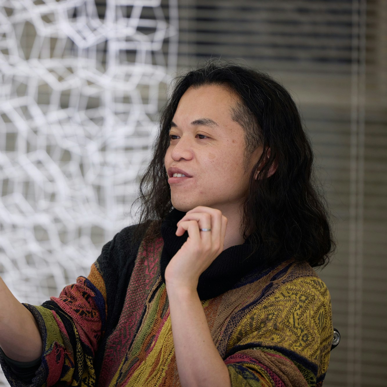 グループのミーティングには作品の構想段階から参加する南。「ダムタイプのミーティングは誰が何について意見を言ってもいい場です。分担されたグラフィック担当として参加しているわけではないんです」と語る南。「作品のコンセプトを話す段階では、自分の役割に落とし込んで考えるようなことはしませんね」と古舘も頷いた。こうした話からも、有機的に個人の役割を変えながら制作を行う、ダムタイプという集団の強みが見て取れる。
