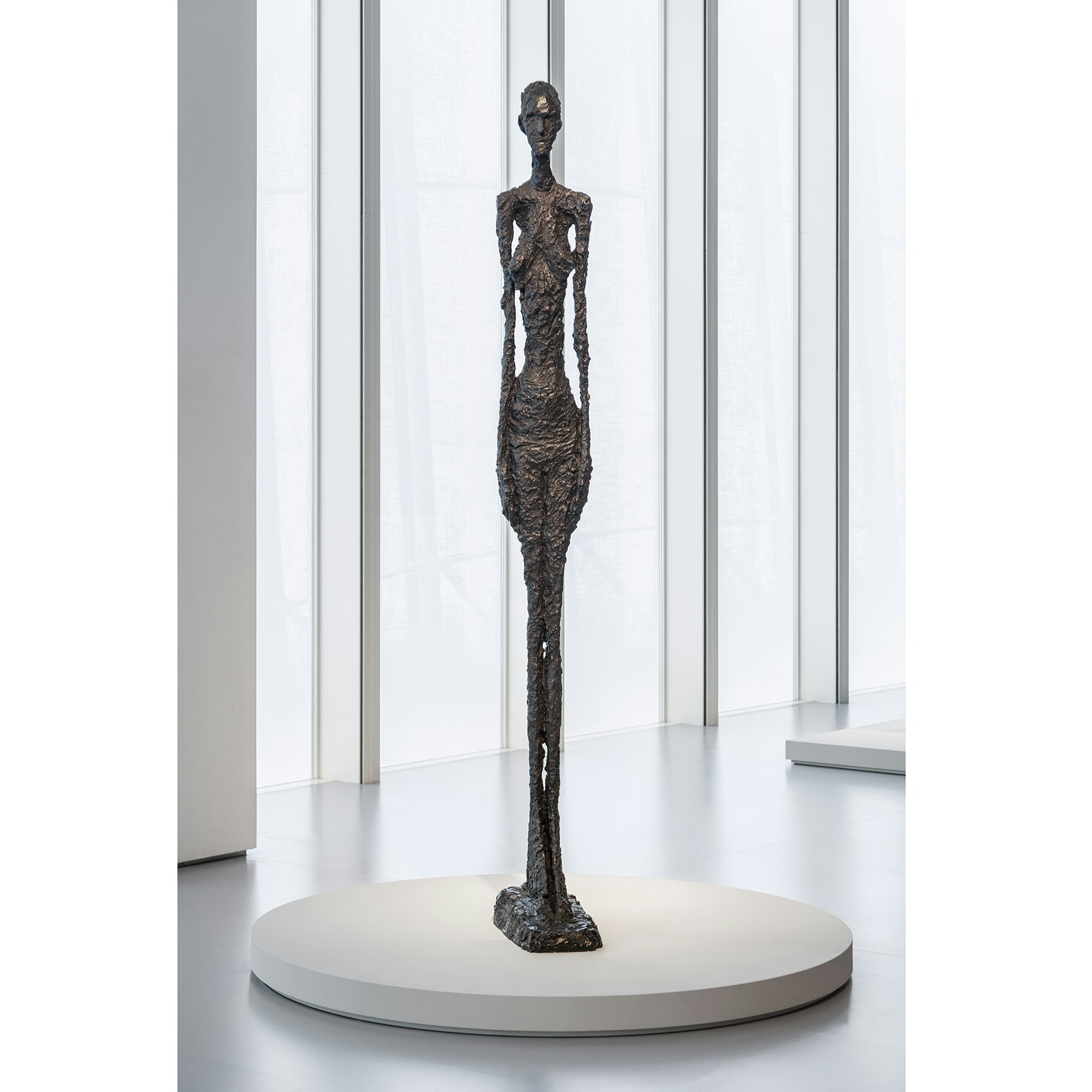 エスパス ルイ•ヴィトン大阪で開催されているジャコメッティ展には、第二次世界大戦を経て細長い彫刻へと向かった時期の7点の彫刻作品が展示されている。会場に足を踏み入れると、最初に出迎えてくれるのは《大きな女性立像Ⅱ》(1960)である。3メートル近い高さの直立不動の女性立像は、もともとは、「歩く男」「頭部」とともにニューヨークのチェース・マンハッタン銀行ビルの広場に設置される予定だった。この計画は頓挫するも、ジャコメッティは継続してこの3点の制作に取り組み、数々の展覧会に出品する。1962年のヴェネチア・ビエンナーレでは完成した3点の石膏像を含む80点あまりの作品が展示され、彫刻部門の大賞を受賞したことで、ジャコメッティの国際的な評価は確固たるものとなった。なかでも巨大な女性立像は目を引いたことだろう。彼が生きていたら苦々しく思っただろうが、2010年のオークションで《歩く男Ⅰ》のブロンズ像が当時の史上最高額の94億円で落札されたことは記憶に新しい。