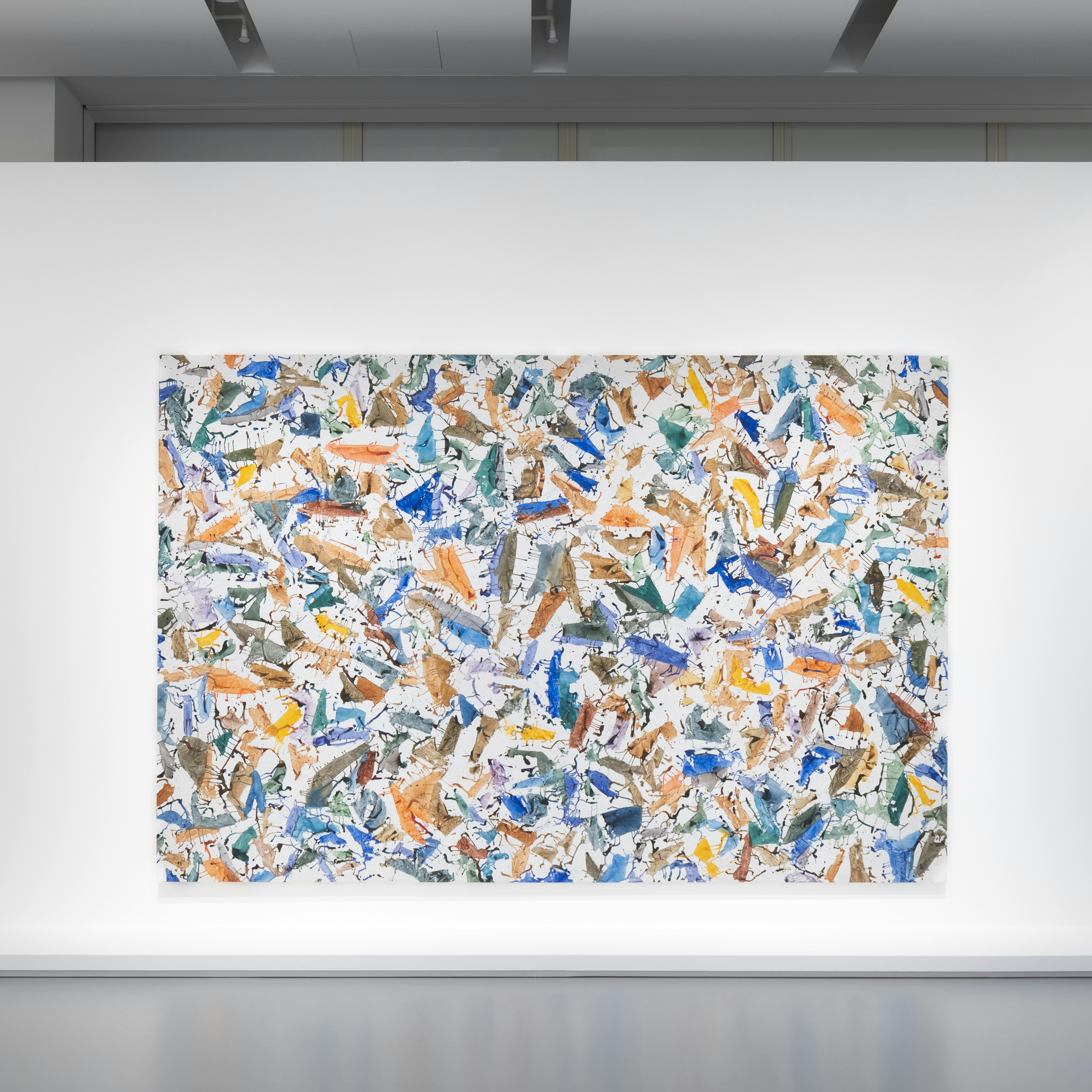 キャンバスの布地をたたむ、折る、部分的に結ぶ、くしゃくしゃにするなど、アンタイの絵画は、木枠に張られる前の支持体の布地が持つ物質的な可塑性、伸縮性や展開可能性を駆使することで制作される。例えば本展でも展示されている「ÉTUDES(習作)」シリーズは、キャンバス地を折りたたみ、顔料で色彩をほどこした後に広げることによってつくられる。この方法においては、絵画はフラットな平面であるという前提が覆されているばかりか、支持体の可塑性と図の表れが強く連動する。アンタイの絵画では、図は屈折展開する地の運動と不可分である。そこでは絵画の支持体という基底面の運動が、その絵画に現れる図(模様)そのものを立ち上げることになるからだ。