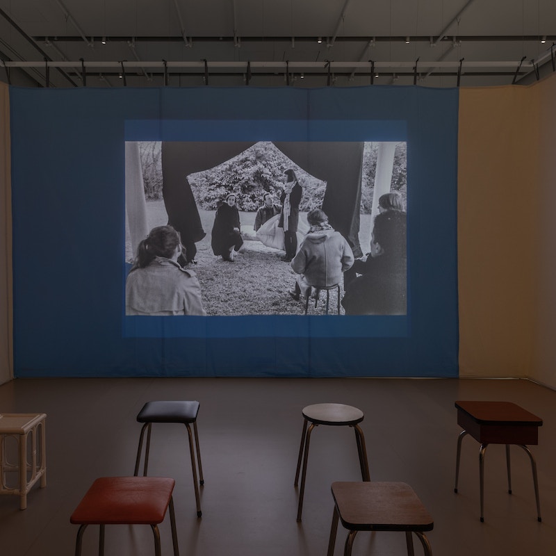 最初に体験する《SINGSPIEL(ジングシュピール:歌芝居)》では、巨大な1枚の布(作家自身による図面によると62.4m)が何度も直角に折れ曲がっていく先に、投影された映像を見るための、モダンなスツールが並ぶ観客席が用意されていた。そして映像には、同様のスツールに腰を下ろし劇が始まるのを待つ観客が映し出される。映像内とギャラリー内の観客席がオーバーラップすることで、私たち観客は、撮影地となったル・コルビュジエ設計のサヴォア邸に招かれたかのようだ。映像の中では、劇中劇を思わせる仮設のカーテンがしつらえられ、やがて10人ほどの家族と思しき人々がダイニングテーブルを囲むが、彼らは奇妙なモノクロ映画の登場人物さながら、掴みどころのない会話を口々に「歌う」。