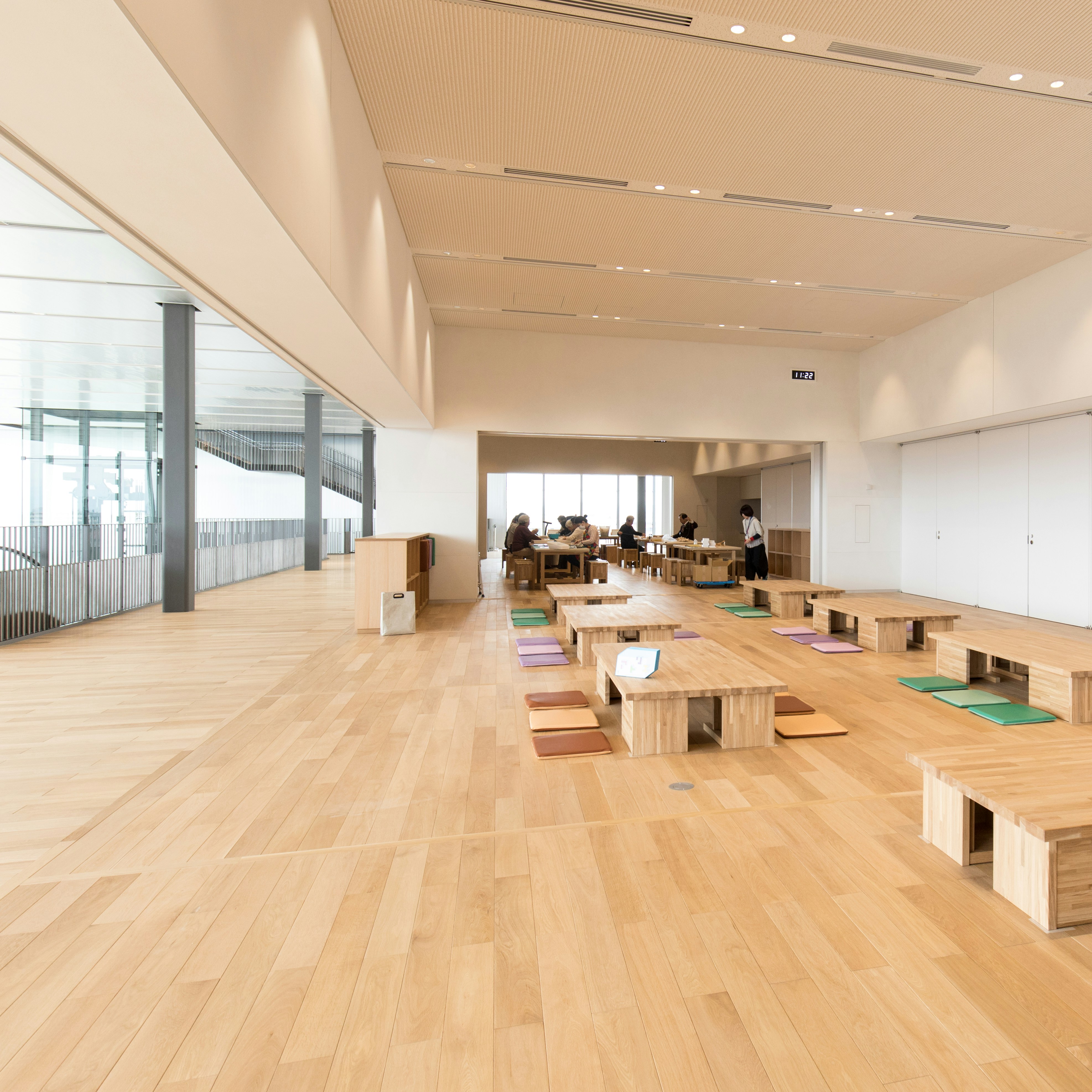 2階に上がると、そこはいよいよ展示室だ。1から4までの展示室は、1と2がコレクション展、3と4が企画展示用になっており、最大で1800平米の空間を展示スペースとして活用することができる。展示室の間にある中央廊下には床から天井まで、富山県産の杉がふんだんに使われ、木の香りとぬくもりを感じられるのが嬉しい。