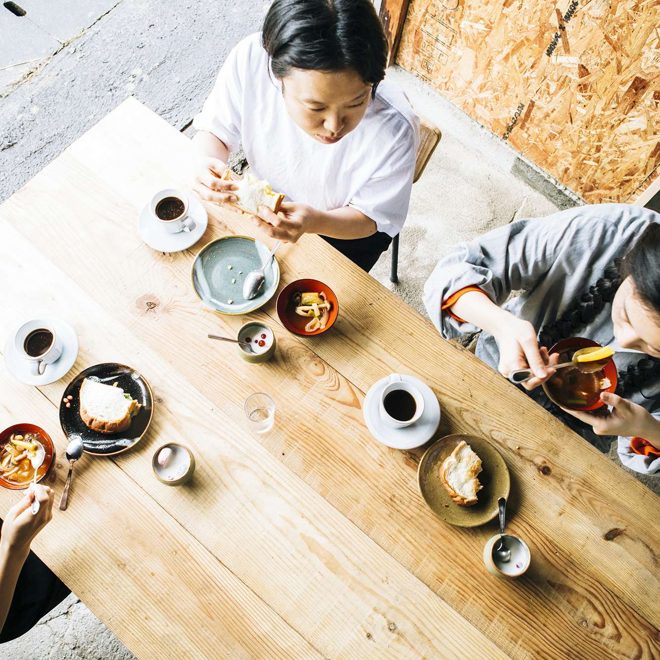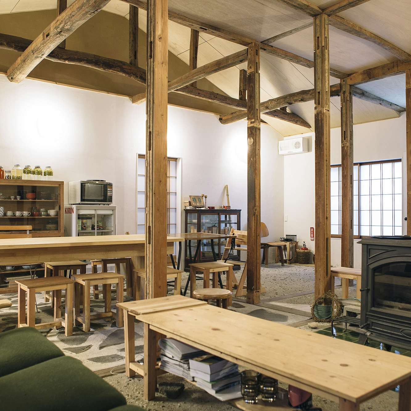 夜中まで女子トークで盛り上がったにもかかわらず、翌朝早起きして朝ごはんをつくる3人。2日目は晴れ間も見えて、半屋外のテラスでモーニング。林さんご夫妻は、近々この場所でカフェをオープンさせたい、と話す。「ochicochi village」とは「あちらこちら」や「現在・未来」という意味の古語「をちこち」が由来だそう。「それらの思いを込めて、古い廃材を利用して自らリノベーションしたり、キッチンには民芸の器を用意したりしています。海外からのゲストが多く、ときにはアーティストが1週間ほど滞在して静かな自然環境で創作活動を行うこともあります。そういったゲストとの交流の影響もあり、最近はリノベーション活動がさらに楽しくなりました。」と林さん。