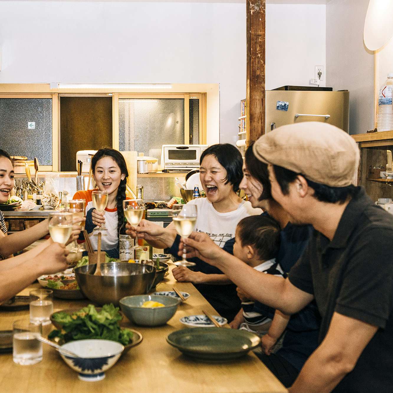 ひとしきり遊んだら、あっという間に夕方に。産地直売所に寄って、地元の新鮮な野菜を手に入れochicochi villageにチェックイン。ホストの林さん一家に温かく迎えられ、早速料理を開始。すると、ほどなくして奥さんがボールいっぱいのベビーリーフを持ってキッチンへ。「今、庭で採ってきた無農薬野菜なんです」と林さん。手づくりのドレッシングでサラダを差し入れてくれた。この日、芸術祭を見にきたという別のゲストとも一緒に信州ワインで乾杯。野菜たっぷりの料理を囲み、大人数での宴になった。