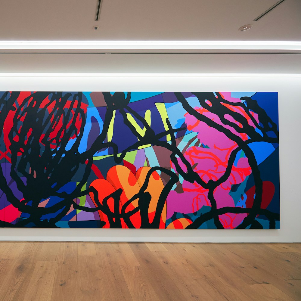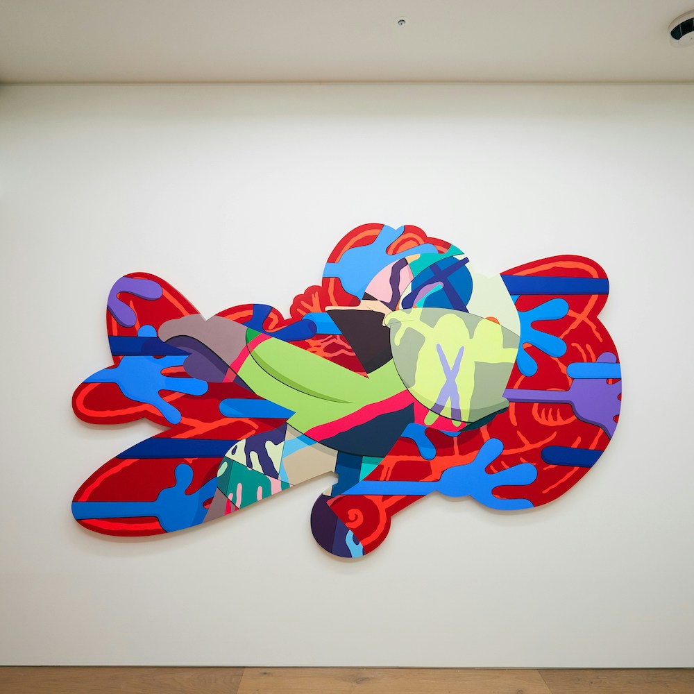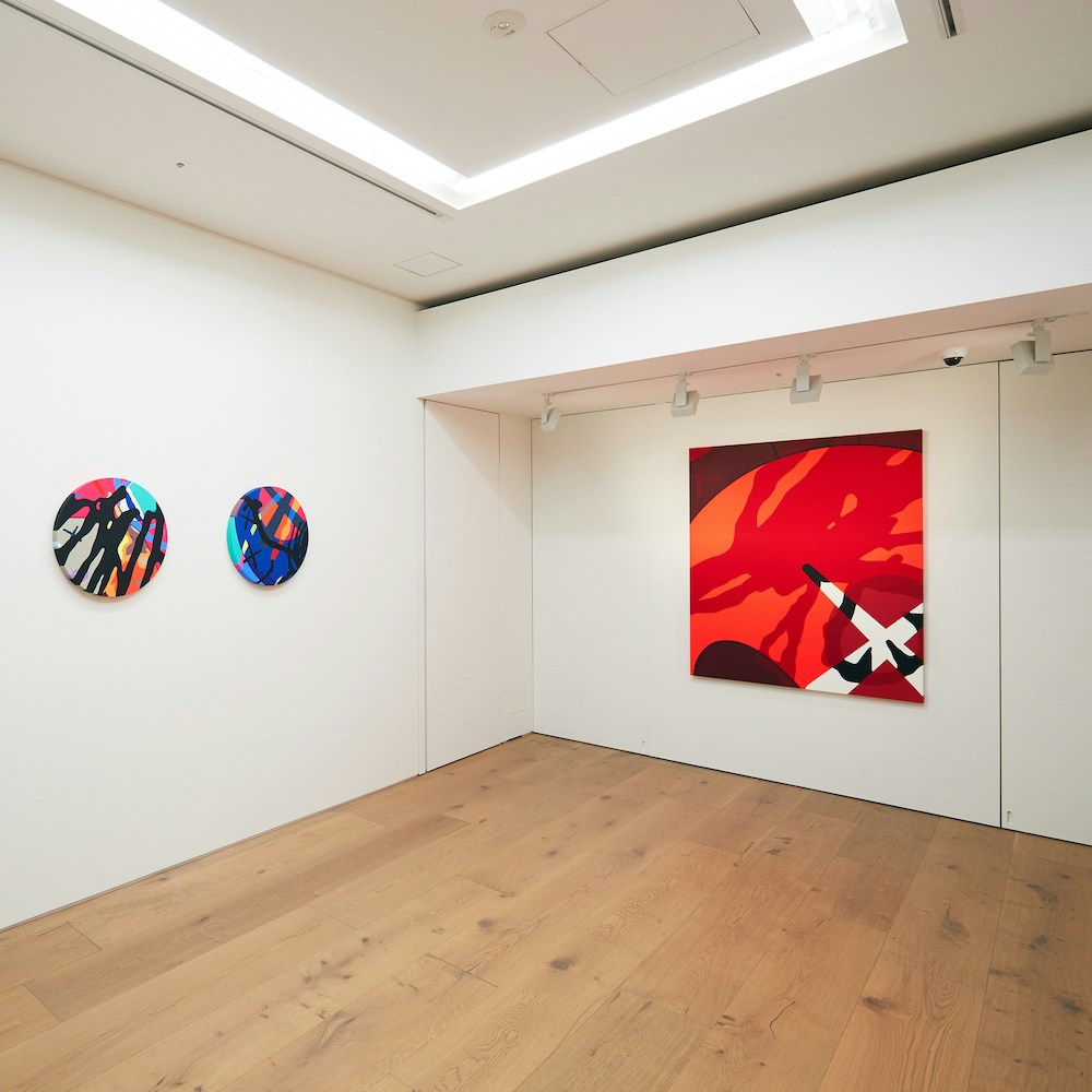 グラフィティアーティスト、トイデザイナー、彫刻家と様々な肩書きで語られるが、いまペロタン東京で紹介されているのは、画家としてのKAWSだ。原色の流線が飛び交うハードエッジ・ペインティングには、ポップカルチャーのキャラクターが節々に垣間見られる。