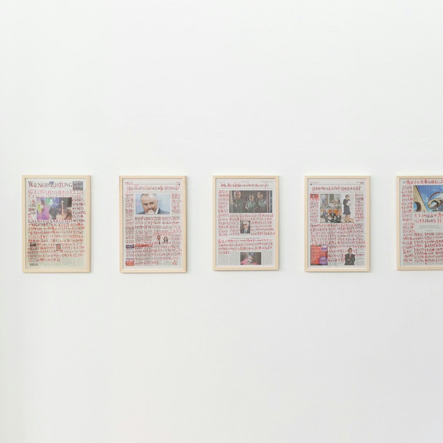 丹羽 使用したのはオーストリアの新聞で、政府のスキャンダルだったり、テロへの警戒の呼びかけ、あるいはスポーツニュースを伝えている。そこに、新聞の内容とは全然関係がない作品制作のアイデアの断片を言葉にして、赤いペンでドローイングした。書かれていることは「日本語を取り戻す」とか「騙される方が悪いに決まっている」とか「新時代の幕開け」とか、政策マニュフェストのような言葉。そういった言葉が無関係な新聞の画像を通じて、新しい展開を見せるといいなと思っている。