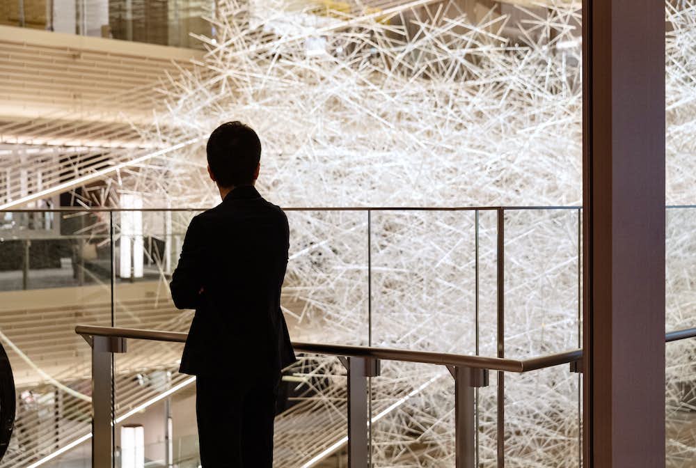 作品を見つめる吉岡徳仁