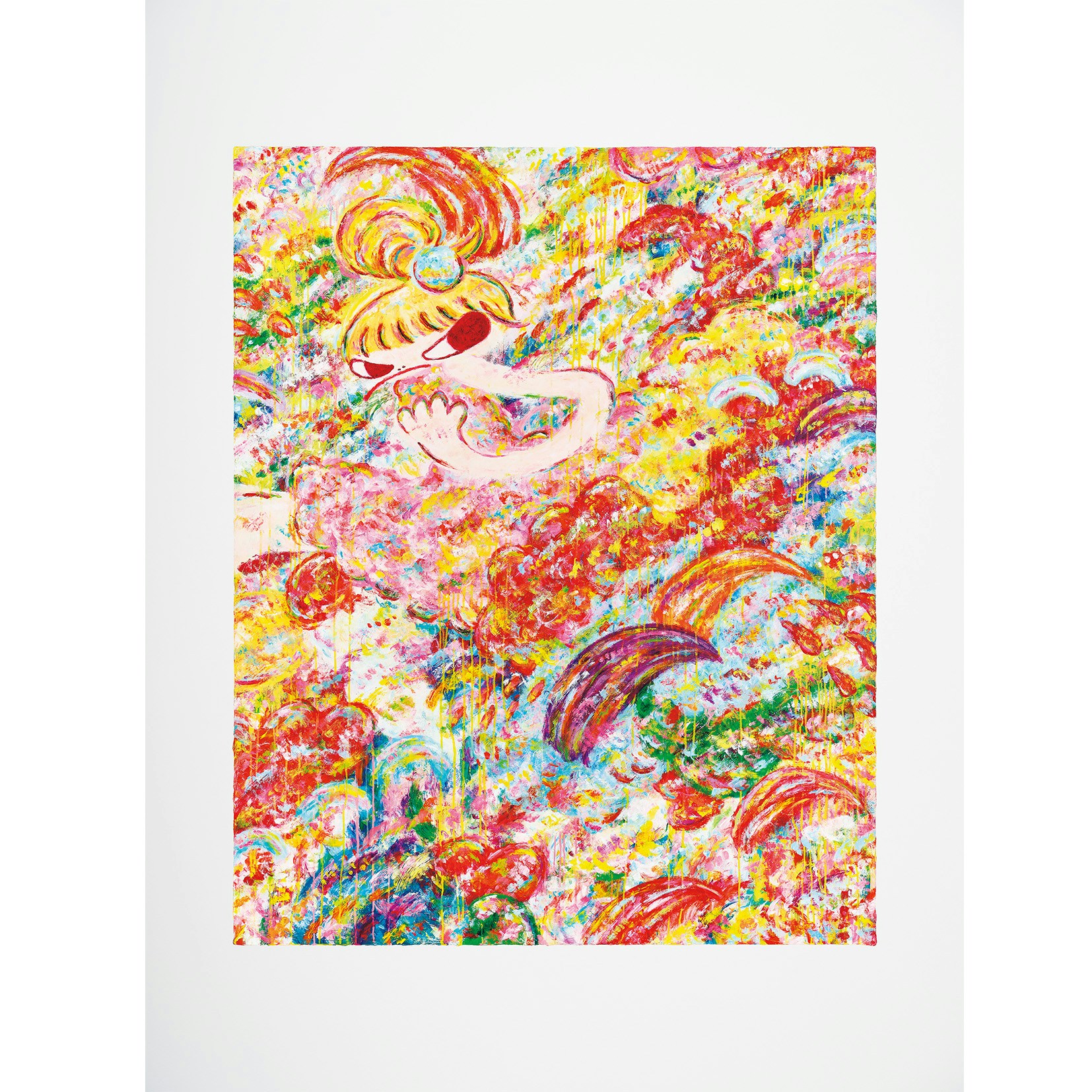ロッカク自身の言及するとおり、ロッカクの芸術の全貌は、少女像だけに収まるものではない。「抽象画だけになっていたかもしれない」と語るように、ロッカクの作品においては具象と抽象が不可分にある。初期は、段ボールを支持体にライヴ感あふれる素早いタッチで描かれた「少女の絵」だった。段ボールの素地を残しつつ、蛍光ピンクやディープブルーの勢いあるタッチで、決して正面には目を向けてくれない少女を描いたが、キャンバスに描くようになってから、絵具のレイヤーを重ねていくことに魅了され、探求が始まった。そこでは、少女の姿が現れこそすれ、色彩が横溢するまばゆいばかりのランドスケープが広がる。