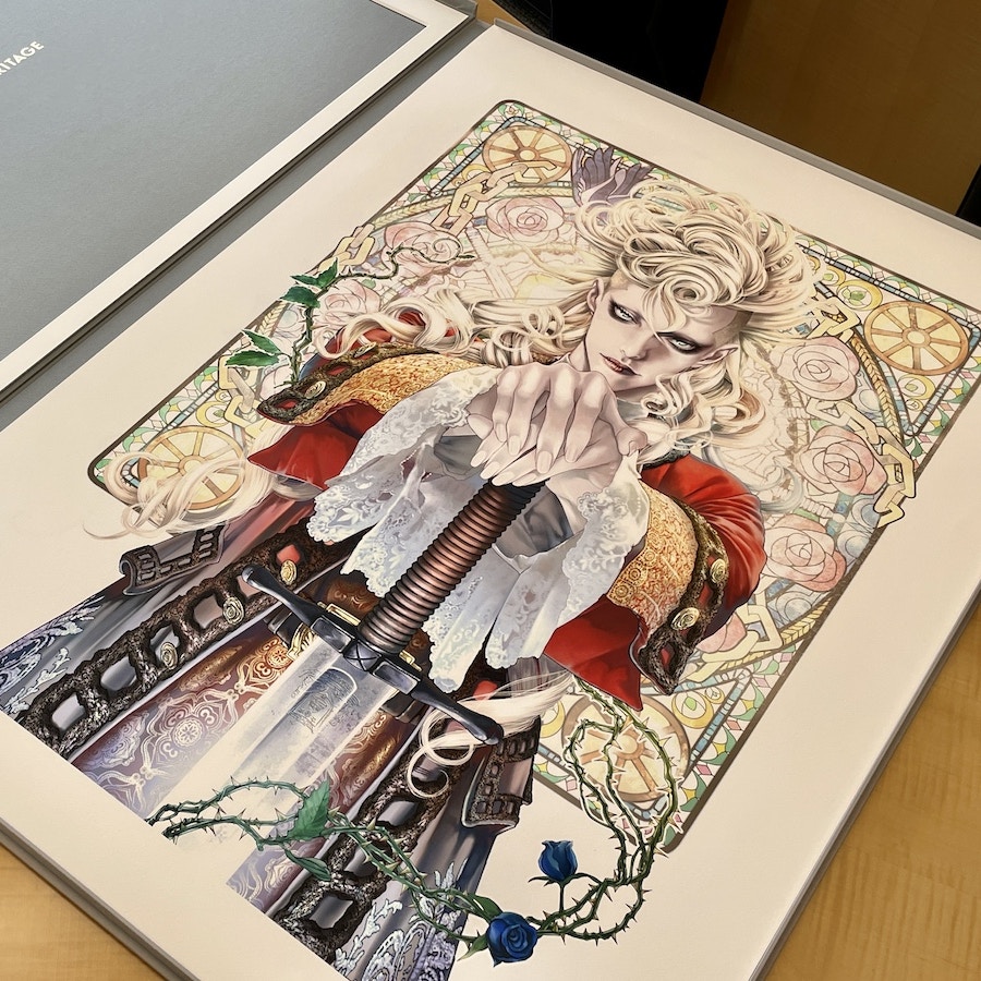 はい、こちらは坂本眞一先生の『イノサン』のカラー原画の「マンガアート」です。坂本先生はマンガを液晶タブレットで制作しているので、そもそも大画面で自分の作品の全体をご覧になったことがなく、本人にも大変満足していただけました。コットン100パーセントの紙を使って、マットでふわっとした風合いに仕上げ、人肌のリアルさを感じられるように仕上げました。