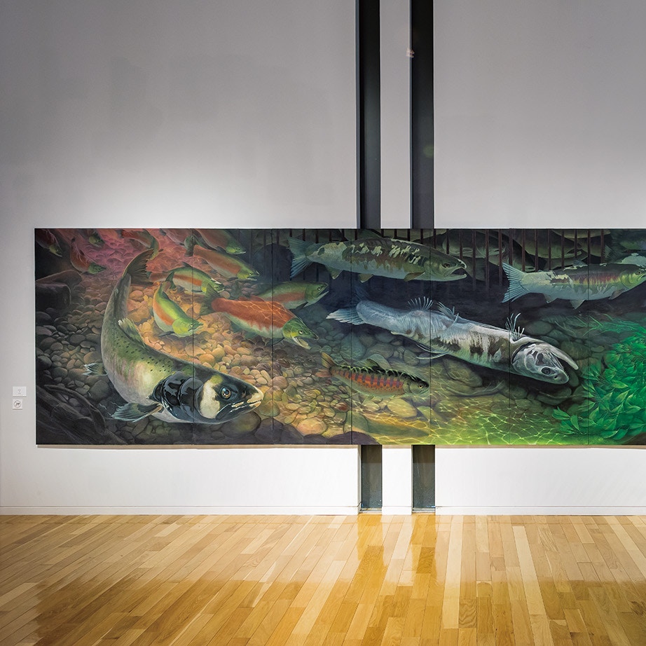 《淵源回帰》のキャンバス上部には孵化場の柵を描いています。それをなぜだかサケたちは超えてくる。そこがたぶん生命の本質だと思います。もっと上流で産卵したいという執念が人と生き物と自然のサイクルを越えてくる。 生死のはざまにある根源的な力を目の当たりにしました。右側にはウロコが白くボロボロになっても上流に上ろうとするサケのすがたを描いています。