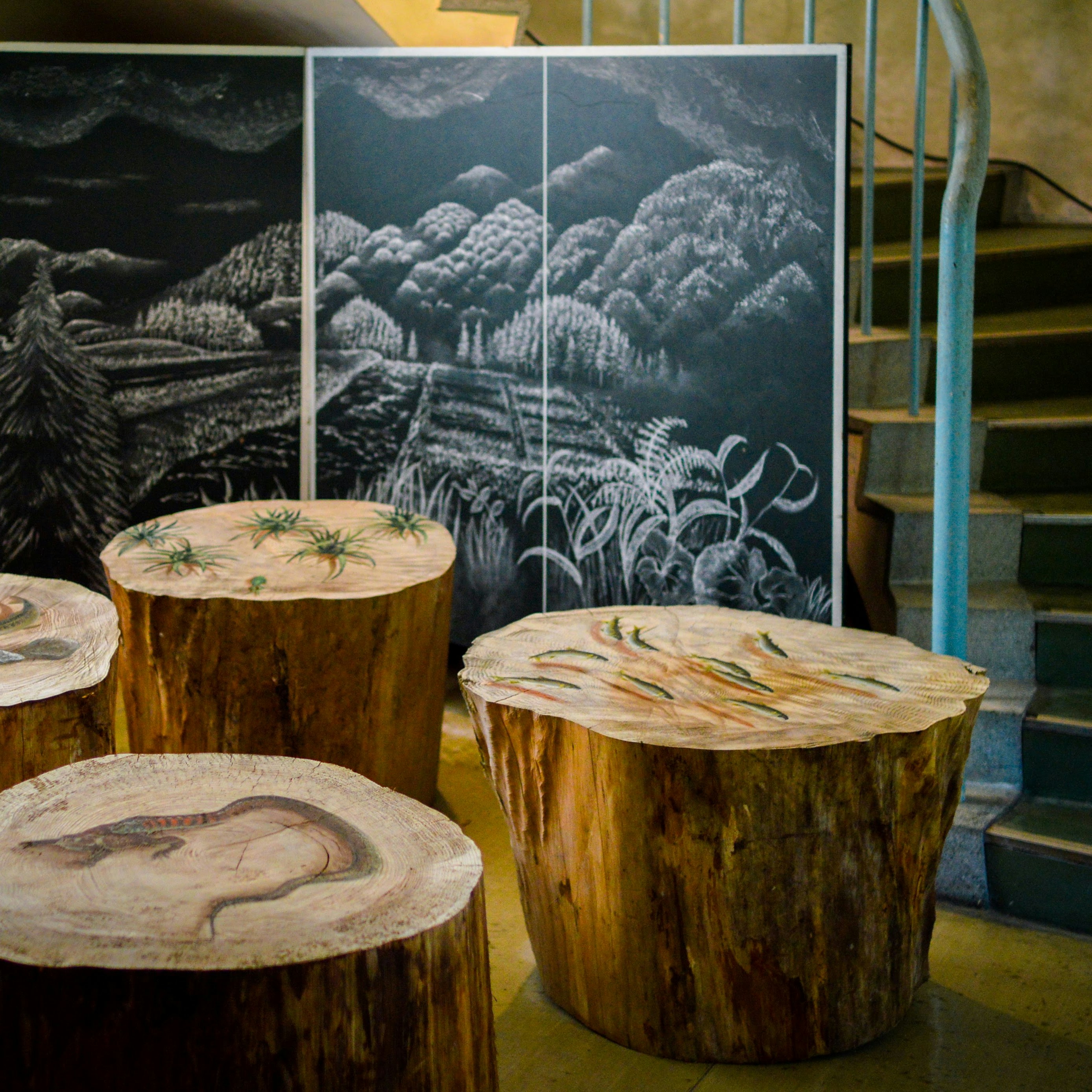 ほかにも秋田県内ではあるのですが、ある限界集落の村で毎年夏に「かみこあにプロジェクト」というアートプロジェクトが行われるんです。それに参加したときは廃校の体育館から卓球板をもらって、教室にあったチョークで絵を描きました。なんだか黒板っぽいなって思って。ほかにも大きな丸太が校庭にドンと置かれていて、話を聞くと東京で建設された新国立競技場で使われた秋田杉の残りでした。そこには、足元にいる生き物や、いつかかたちが変わってしまうかもしれない村のすがたを描きました。