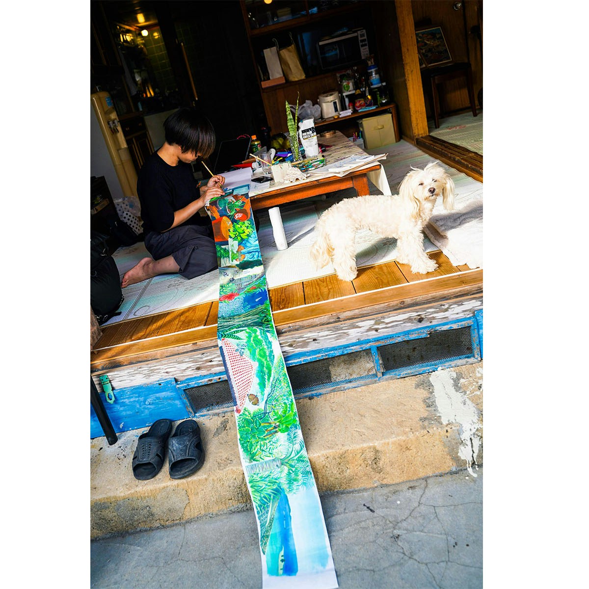 2019年に沖縄のうるま市で開催された「うるまシマダカラ芸術祭」で滞在制作をしたことがあります。絵は沖縄に置いてきちゃったのですが。大がかりな作品の場合、会期後に地元の人々で維持していくことが負担になったり、持って帰らないと解体されてしまうことが多いのですが、その地で描いたものはその地に残しておきたかったんです。そのときは古民家に住まわせてもらっていたので、そこに置いておける巻物の形式で絵を制作しました。この巻物をきっかけに、その地の方々が滞在制作での出会いを思い出してくれたらありがたいと思ったんです。