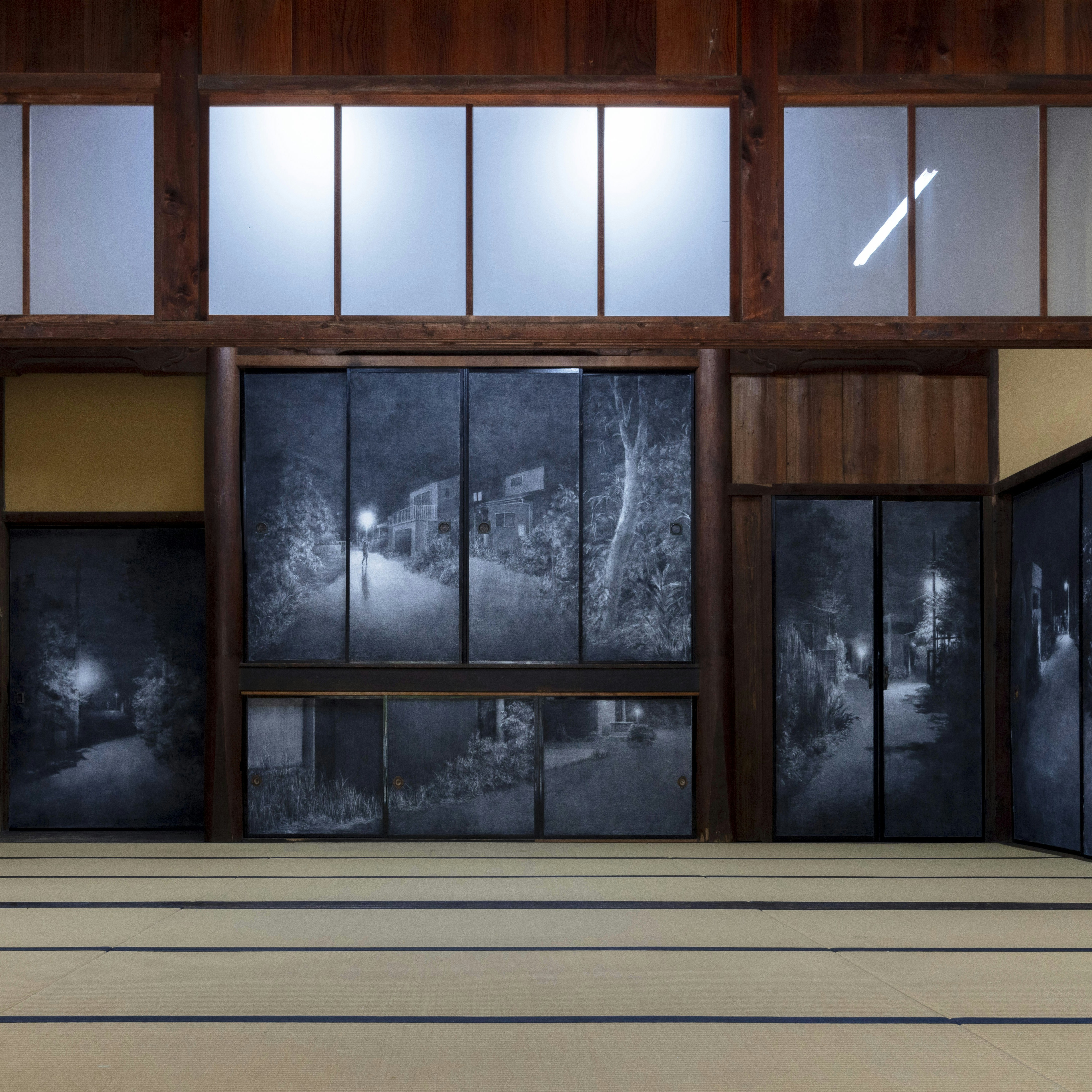 グリッド状の襖に描く際、より風景の広がりを演出し、限定的な場所の表現から解放するために、襖ごとに絵の消失点が少しずらされている