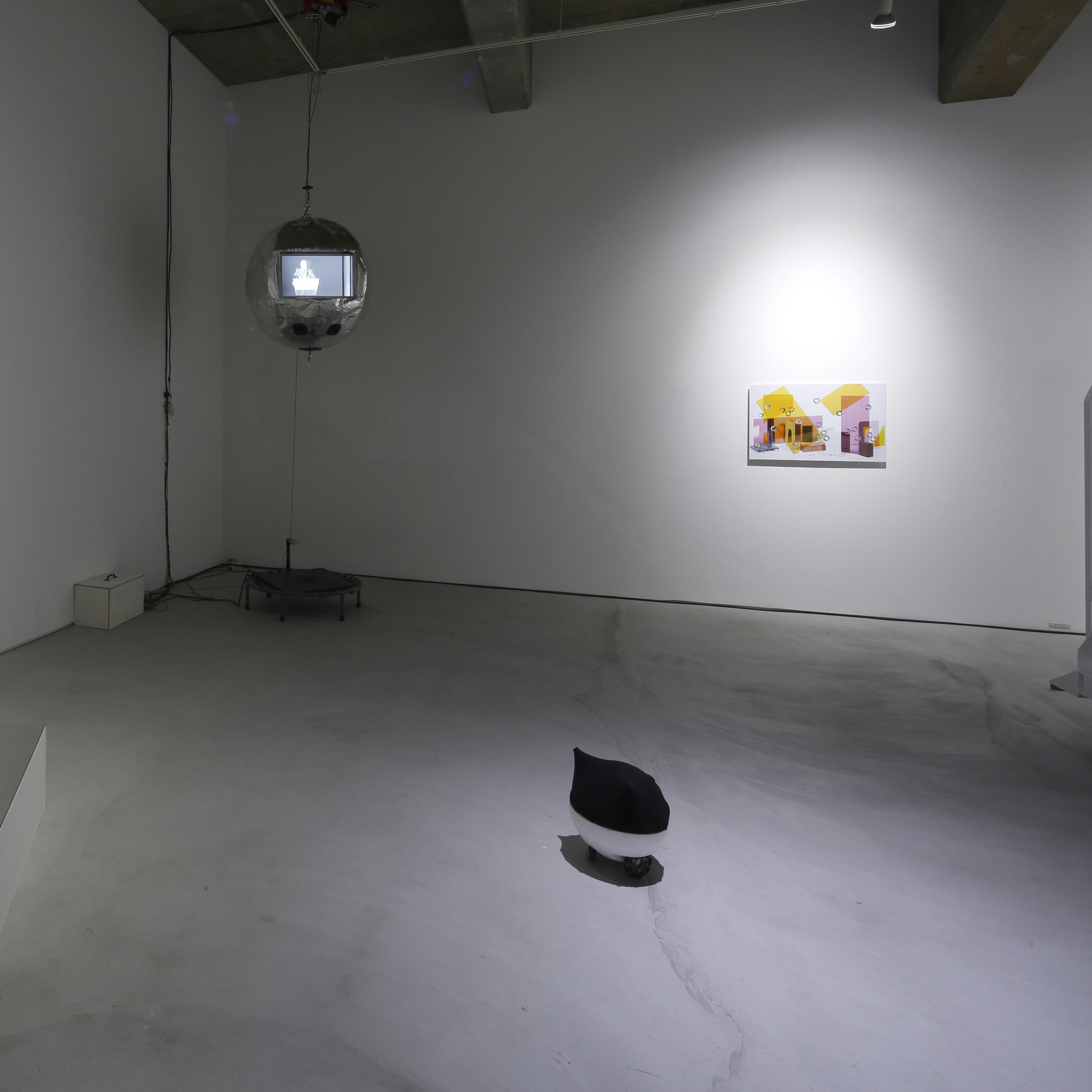 「Malformed Objects」展会場風景。左から篠崎裕美子《SAVE POINT》、涌井智仁《BOMBERMAN》、高田優希《IoO -Internet of Objects-》 、永田康祐《Function composition》 Courtesy of YAMAMOTO GENDAI Photo by Keizo Kioku