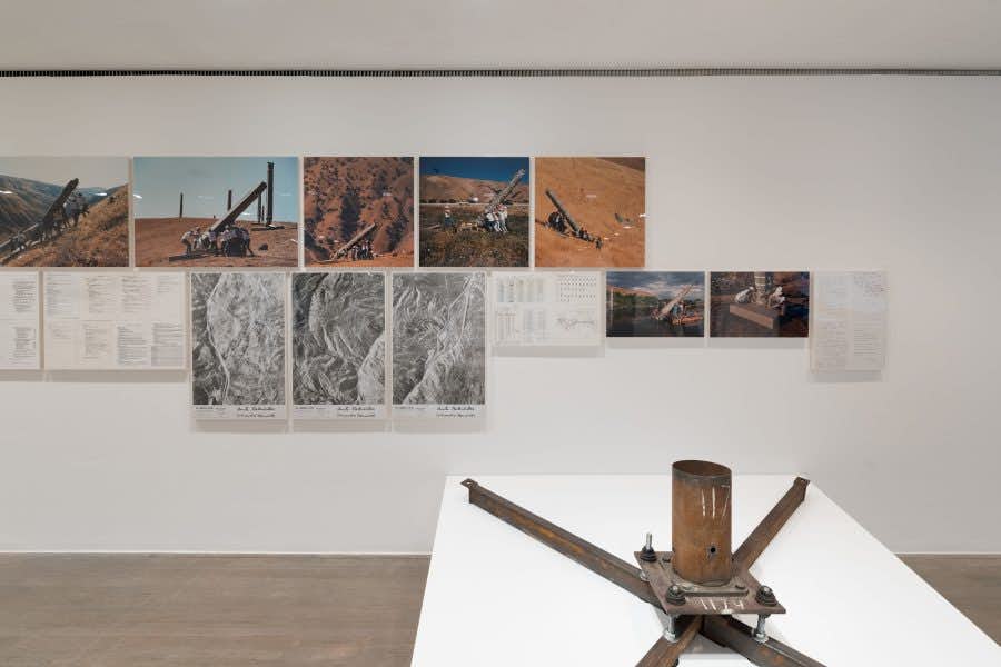 展示風景より。当時のメモや地図が多数展示された。写真手前は、実際に用いられたアンブレラの台座部分 撮影=根本譲 写真提供=水戸芸術館現代美術センター