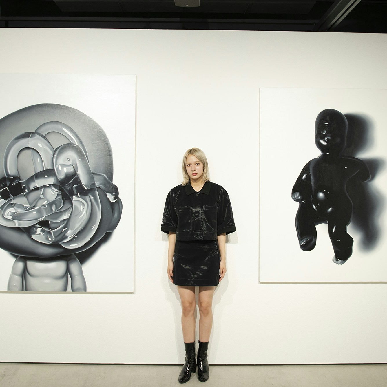 モノクロ作品を展示するのは今回が初めてなのですが、私はもともとすごく色にこだわりがあります。1色をつくるのに4時間ぐらいかけて混色を試すこともありますし、スライムのヌルヌル感を色でどうやって表現できるかというのはすごく大事にしています。そのように続けてきて、もしかしたら黒の深みみたいなものがあるのではないかと、ふと思う瞬間がありました。黒はすべてを破壊する色ですが、もしかしたら、一番創造的な色にもなるかもしれないと。今回は黒と白の2色を基本として、どれだけ色の深みを表現できるかということにチャレンジしました。