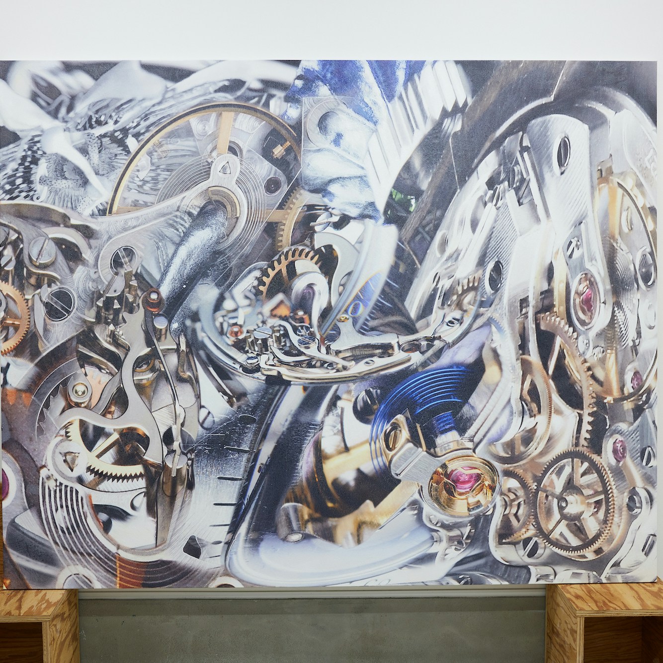 牧田 反射を描くのは私の制作の「キモ」です。反射面は観る側が絵のなかに入り込むとっかかりになりますし、反射によって写り込むもので人間社会を写し出せないかという思いもあるので。反射の様子も含めて、私は自分で撮った写真をPC上で組み合わせ、その図柄をもとに描いていくんですが、もとになる写真はかなりランダムにバシャバシャ撮っていきます。取材や素材集めのために街に出かけますが、ここを切り取ったら作品に使えそうという予想は大体ハズレて、適当に撮っていた写真の方を作品に採用したりします。そうやって、偶然性を作品のなかに呼び込みたいのかもしれない。