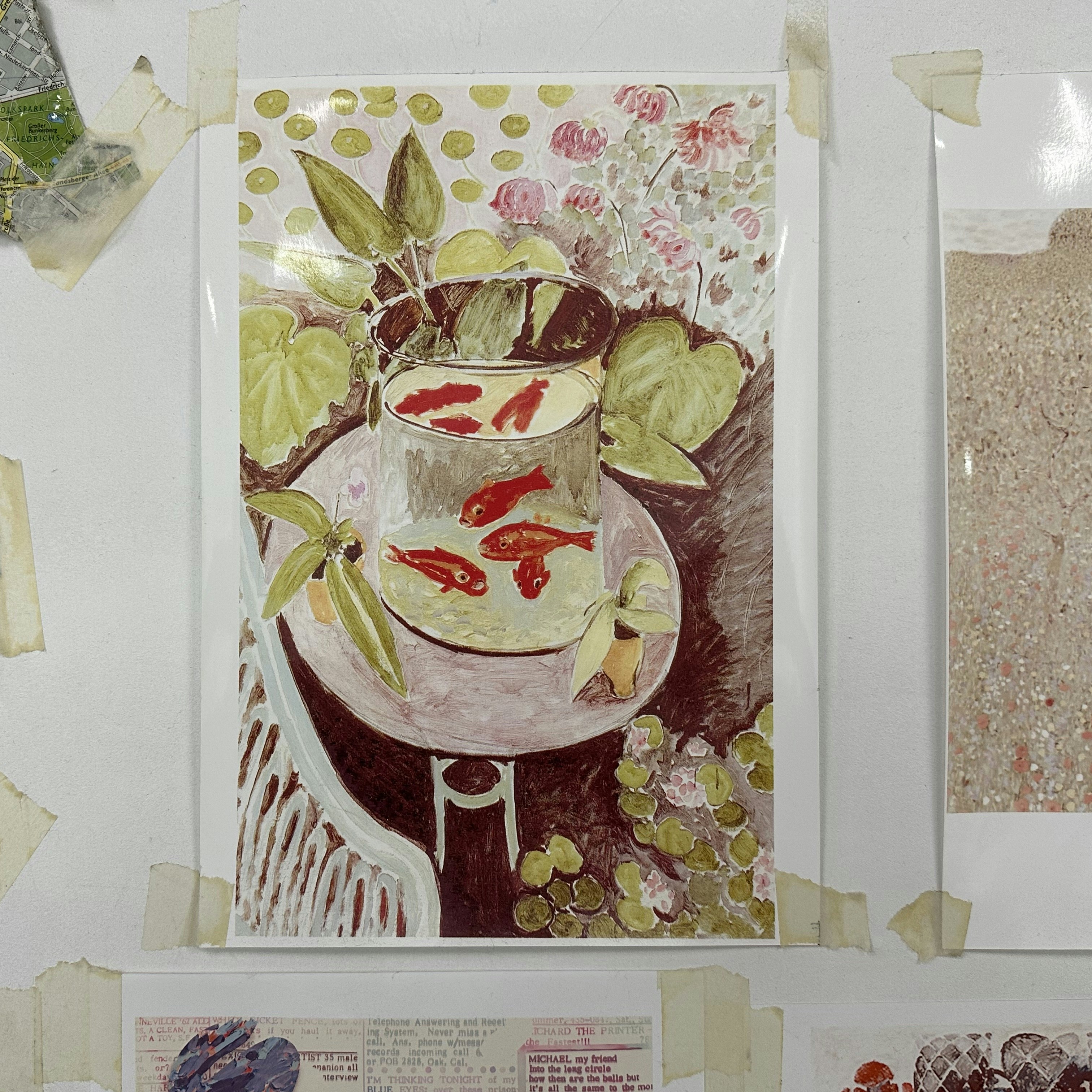 山本 その通りだと思います。僕は以前実物を見て衝撃を受けたマティスの絵画作品《金魚》の印刷をアトリエに貼っています。もう何年も経つのに、いまだに新しい要素を見つけることがあって驚きます。一枚のなかに本当にいろんなことが織り込んであるものなんですよね。例えば金魚の位置が水中と屈折した水面とで変わっているんですけど、それは屈折に重ねて時間のズレも表しているんだろうとか。テーブルの足を隠してあるのは、床面を定位させる要素を見えなくすることで、空間を安定させないようにしているんだろうとか。一見かわいらしい絵なのに、さりげなく時間と空間を揺るがしているところがヤバすぎる(笑)。