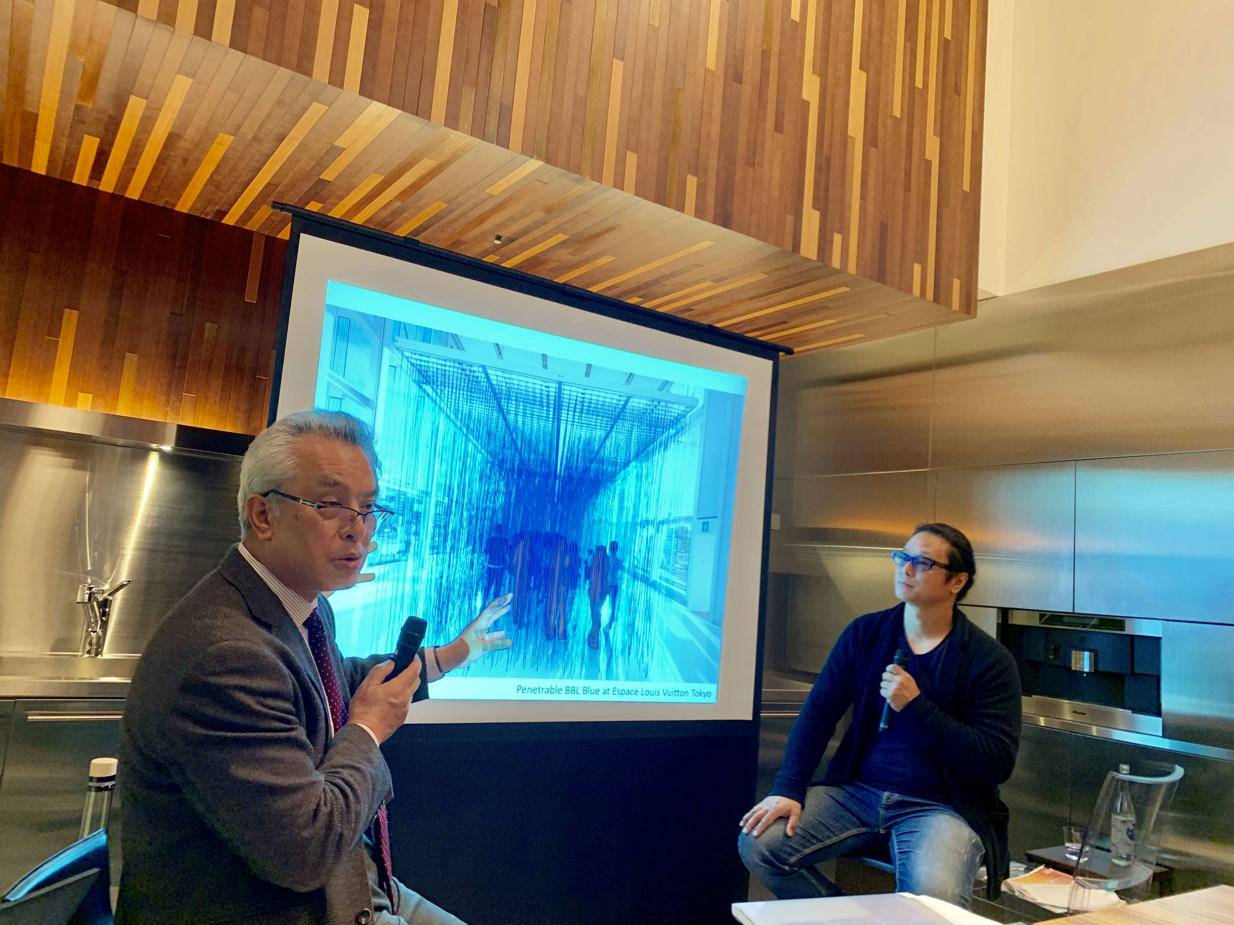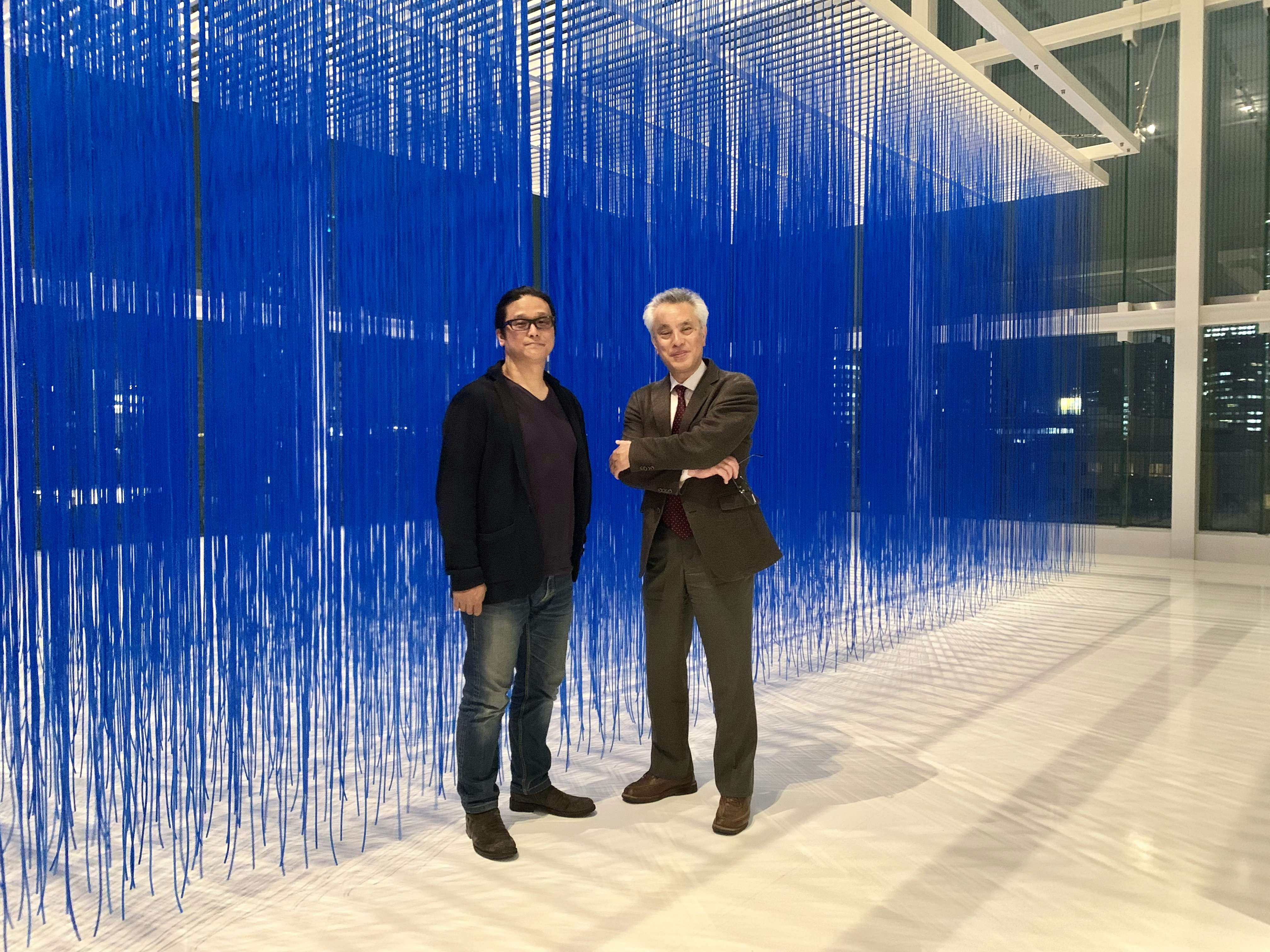 左から大巻伸嗣、水沢勉 Jesús Rafael Soto – Pénétrable BBL Bleu展(エスパス ルイ・ヴィトン東京)にて