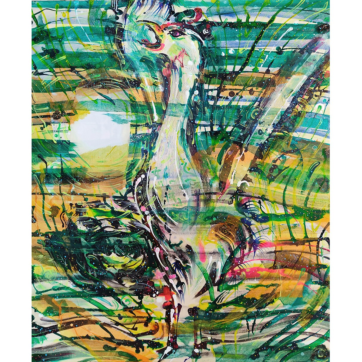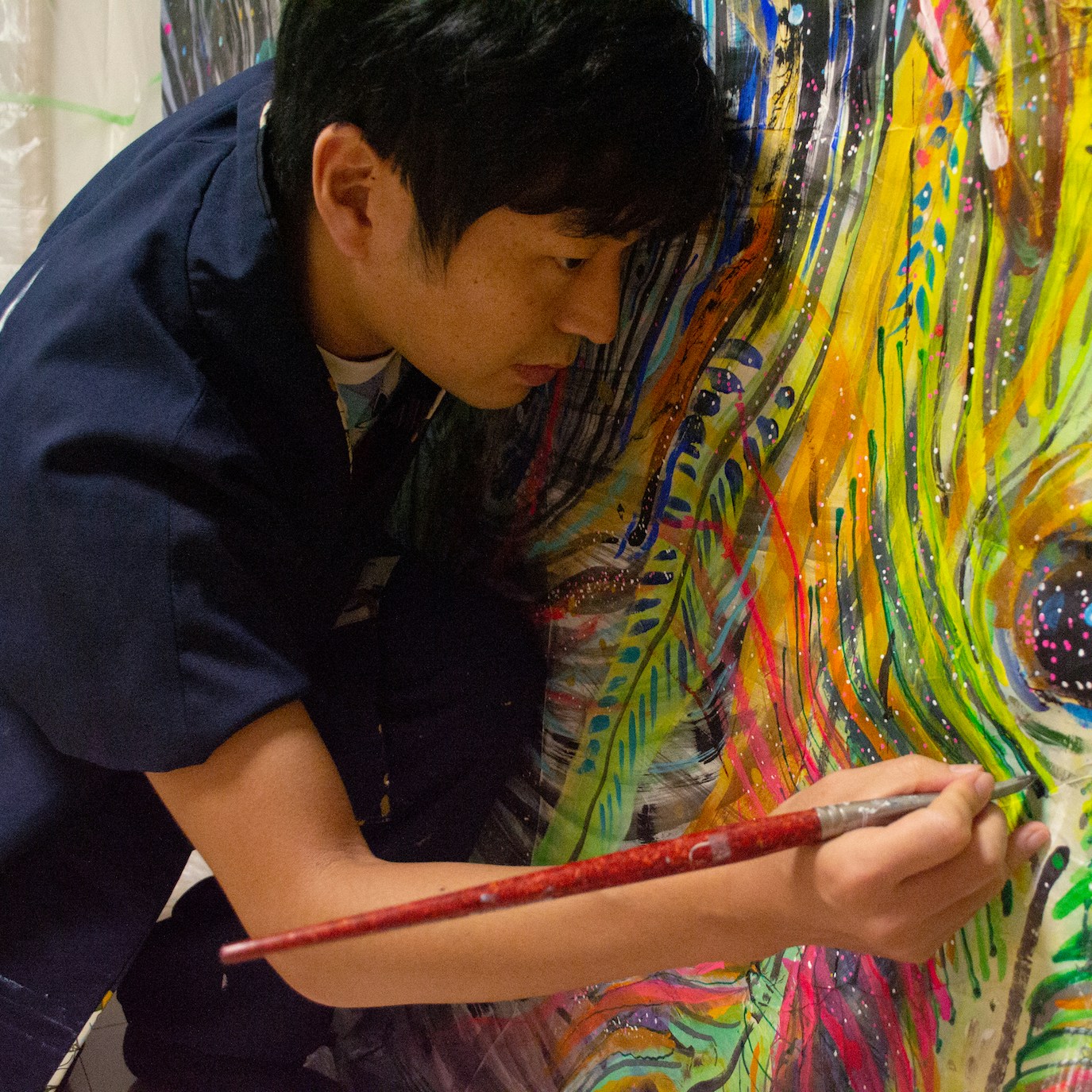 幼い頃、足の病気で歩くことができず、空想の絵を描く日々だった。美大に進み、ストリートダンスに出会って以来、15年以上ダンスシーンで活動してきた。絵筆を執るときは自身でつくったプレイリストを再生し、音楽に合わせて踊りながら線を描いていく。