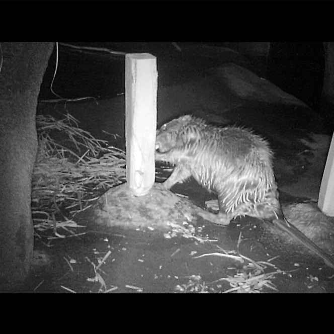 この作品は、5つの動物園とそこで暮らすビーバーたちに協力してもらいました。ビーバーはダムをつくって池をつくり、その真ん中に彼らが安全に暮らせる巣をつくります。自分たちの暮らしのために周囲の環境をつくり替えるビーバーの習性は、人間に通じるものがあると感じています。ビーバー池には、ヘラジカや渡り鳥など、いろいろな動物が集まってきて、新しい生態系が生まれている。ビーバーのものづくりがほかの生き物にも影響をおよぼしているところがとても興味深いと感じています。