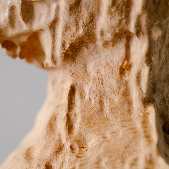 意外にも、機械にも特異性が現れてくるんです。CNCは回転するドリル刃をコンピュータで制御して切削する工作機械です。機械なので、木目の方向や節の堅さを考慮することはありません。ビーバーと違ってCNCは最初に削るルートが決まっているんです。完成させたい形状のデータが先立ってあり、そのデータから最適かつ最短だと思われるドリル刃の動きをあらかじめ計算から割り出して、そのパスに沿って動くように、コンピュータから指令を出す。使用したドリル刃の痕跡が独特な彫り跡として残ります。出てくるものにその癖がついてくる。そこにはビーバーのかじる歯の癖にも通じるものを感じますね。 ビーバーはつねに2本の前歯でかじるので、前歯の幅の2本の並行したノミ跡のようなかじり跡になっています。そうなると、ビーバーがつくった原型をスキャンして、それをそのまま拡大しているだけなのに少しずつずれも出てくる。となると、ますます作者の存在が曖昧になっていきます。